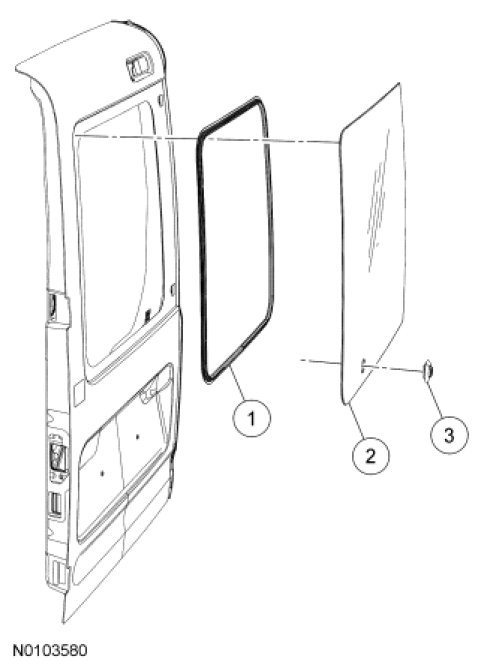 NOTICE: Before positioning the rear door glass, open vehicle windows to prevent the air pressure of closing doors from affecting the urethane adhesive bond.