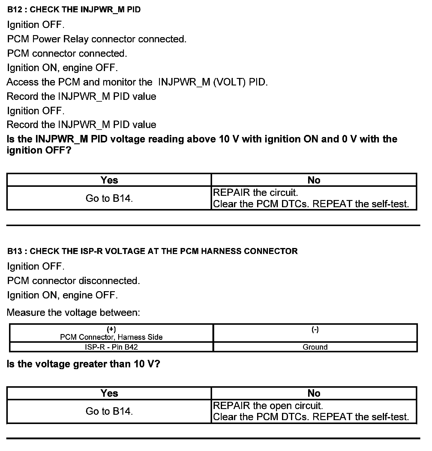 Home >> Ford >> 2012 >> Edge AWD V6-3.5L >> Repair and Diagnosis >> Powertrain Management >> Computers and Control Systems >> Testing and Inspection >> Pinpoint Tests >> Test B: Powertrain Control Module (PCM) Power Relay