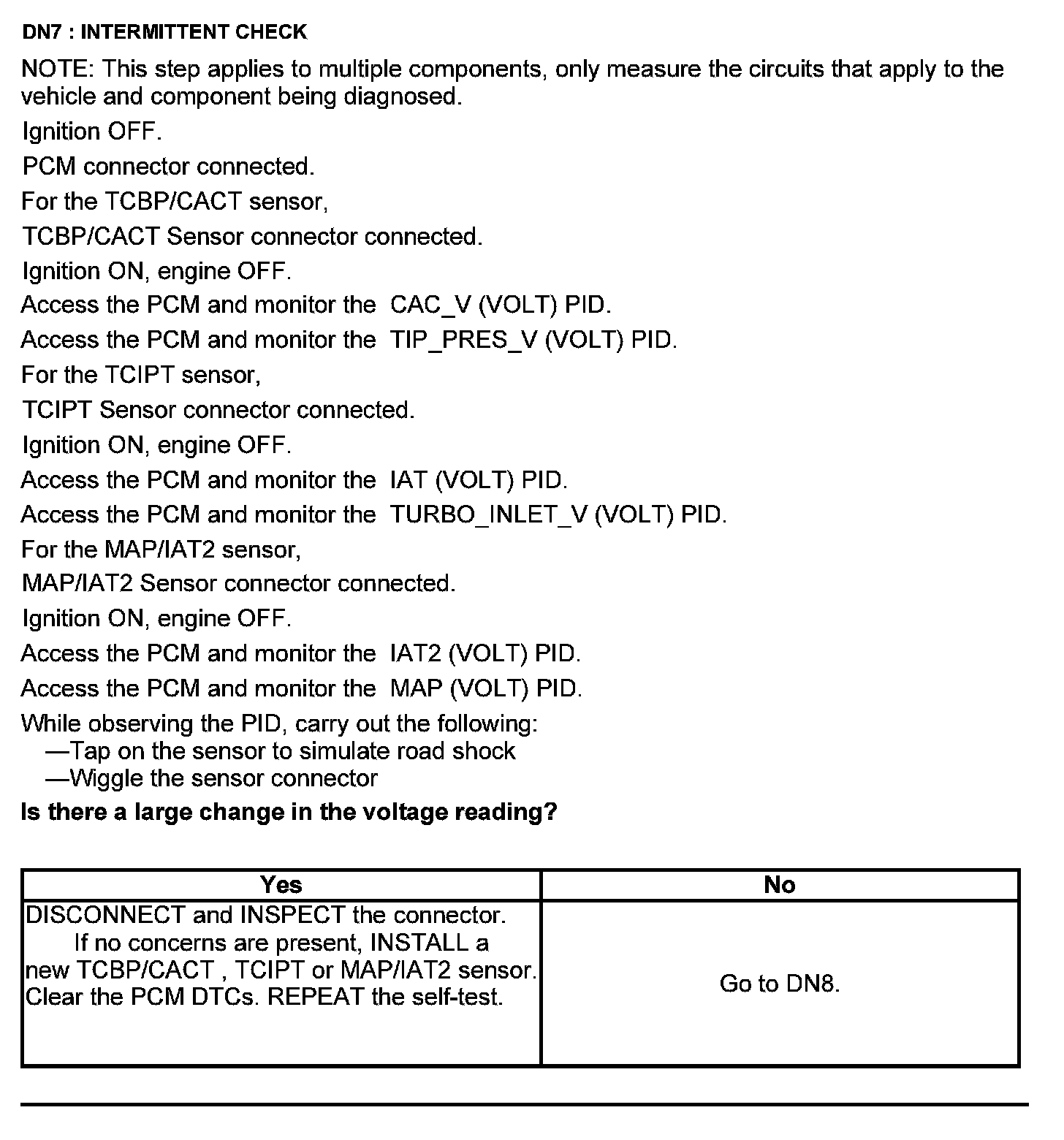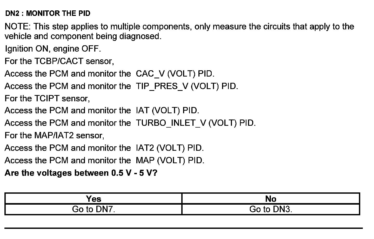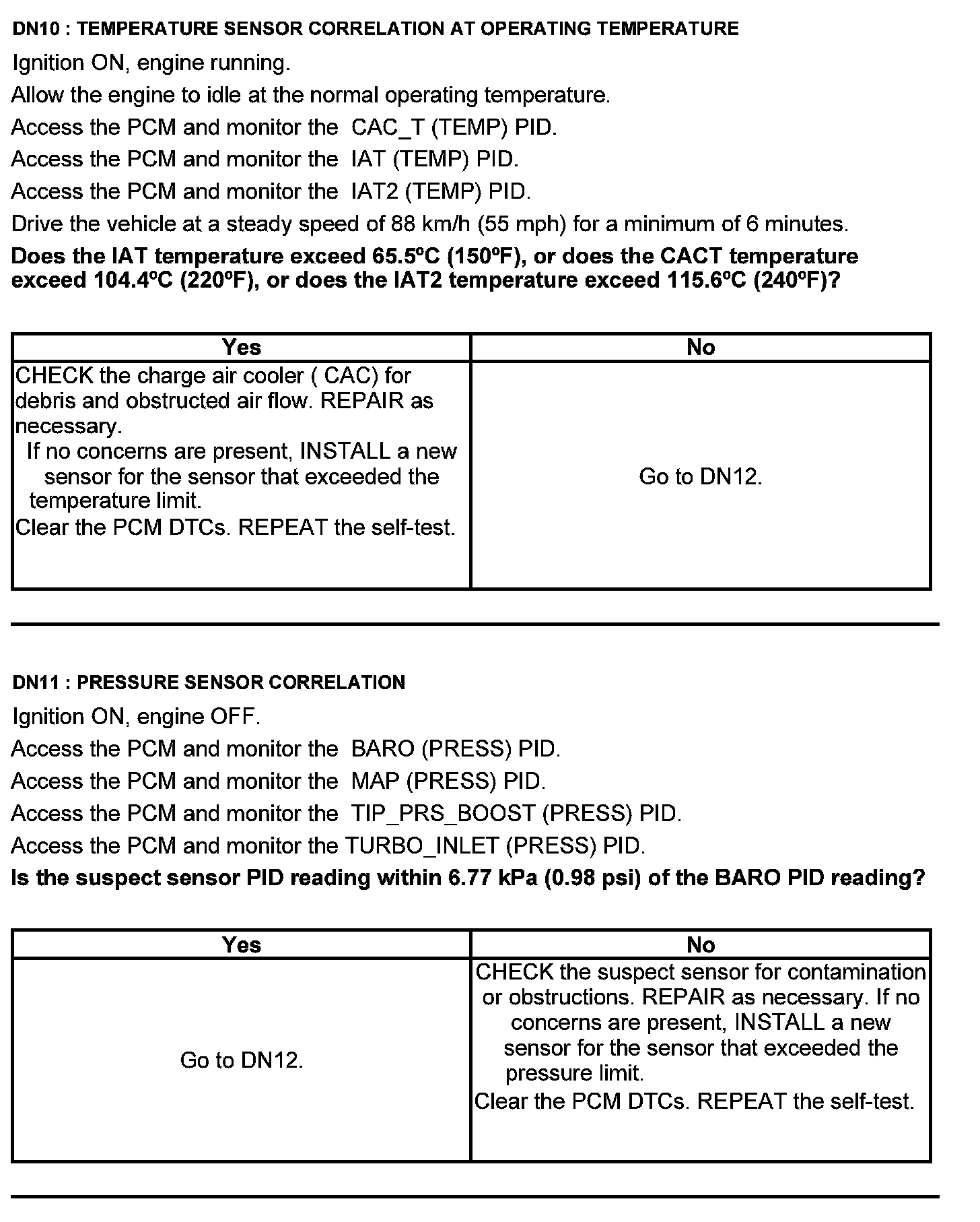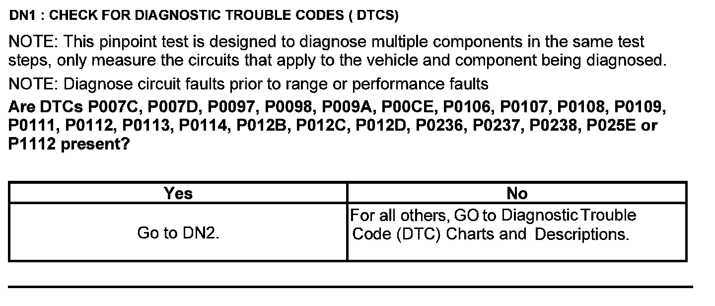 Home >> Ford >> 2012 >> Edge AWD V6-3.5L >> Repair and Diagnosis >> Powertrain Management >> Computers and Control Systems >> Testing and Inspection >> Pinpoint Tests >> Test DN: Pressure and Temperature Sensors