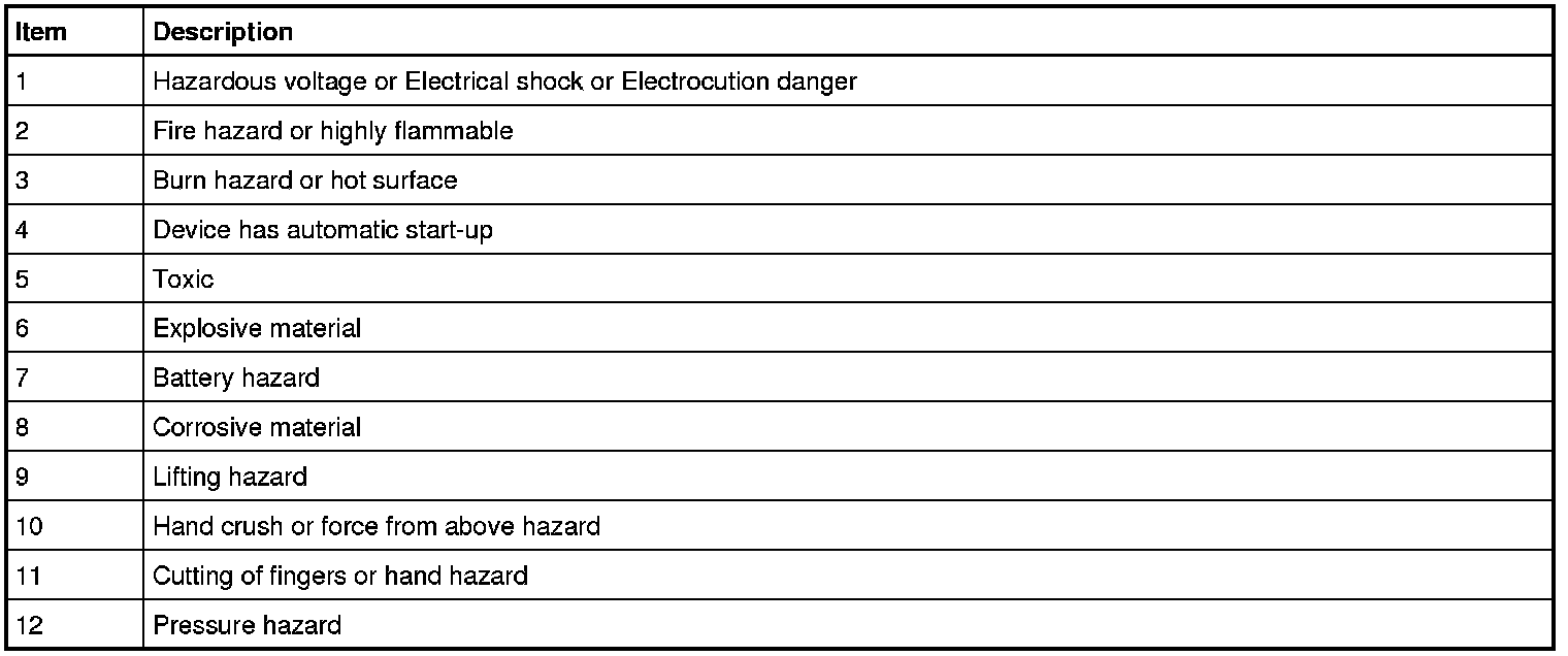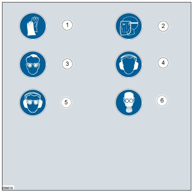 The protective equipment symbols indicate required safety equipment to avoid or reduce health and safety risks.