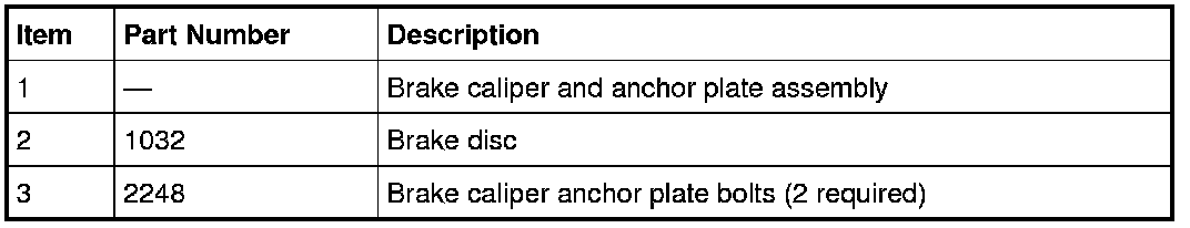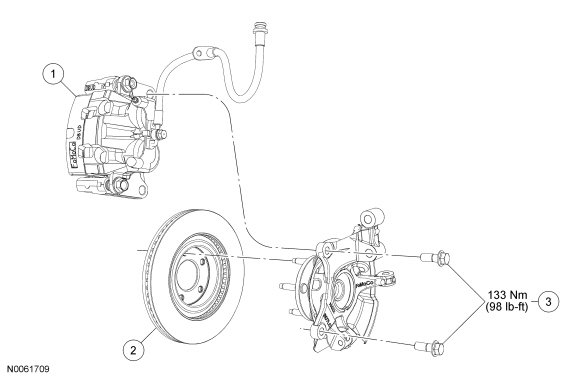 2. NOTICE: Do not allow the brake caliper and anchor plate assembly to hang from the brake hose or damage to the hose can occur.