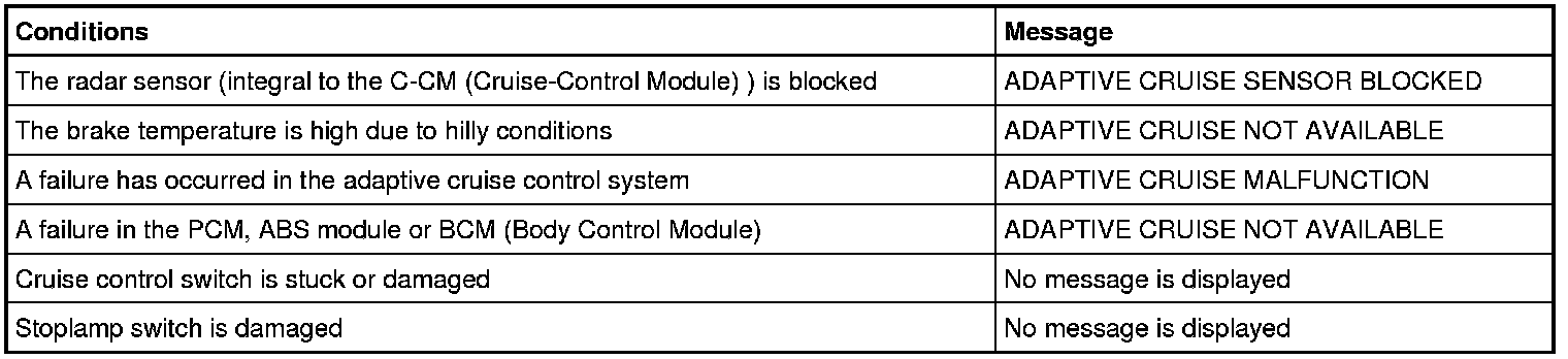 There are several conditions that can exist to cause the adaptive cruise control system to deactivate or prevent the system from activation. Some of the conditions have a message that is displayed in the message center. These conditions include: