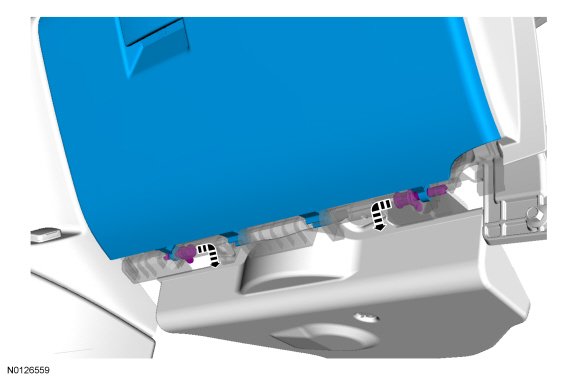 2. Release the stops by pressing them toward the center of the glove compartment while lowering the glove compartment, and remove the glove compartment.
