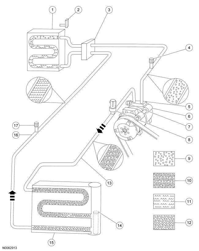 The A/C condenser, being close to ambient temperature, causes the refrigerant vapor to condense into a liquid when heat is removed from the refrigerant by ambient air passing over the fins and tubing. The now liquid refrigerant, still at high pressure, exits from the bottom of the A/C condenser and enters the inlet side of the A/C receiver/drier. The receiver/drier is designed to remove moisture from the refrigerant.