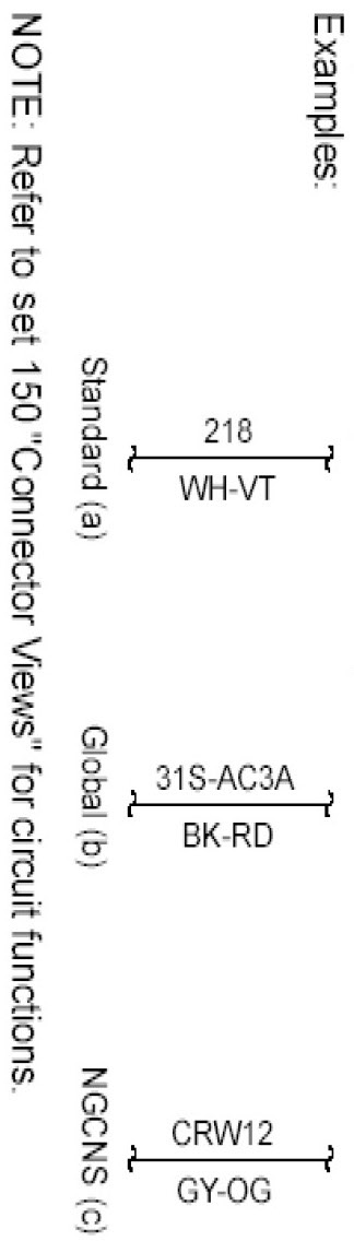 Ford Motor Company uses three different circuit numbering conventions: Standard Circuit Numbering System, Global Circuit Numbering System, and New Global Circuit Numbering System (NGCNS). With each, the circuit number (which identifies a specific circuit function) is followed by the wire color.