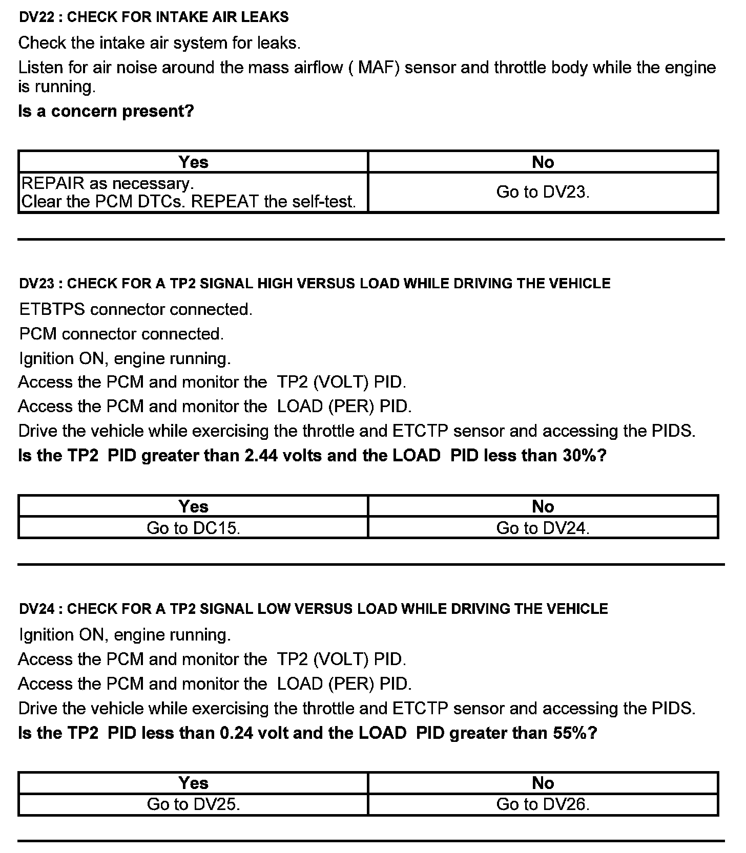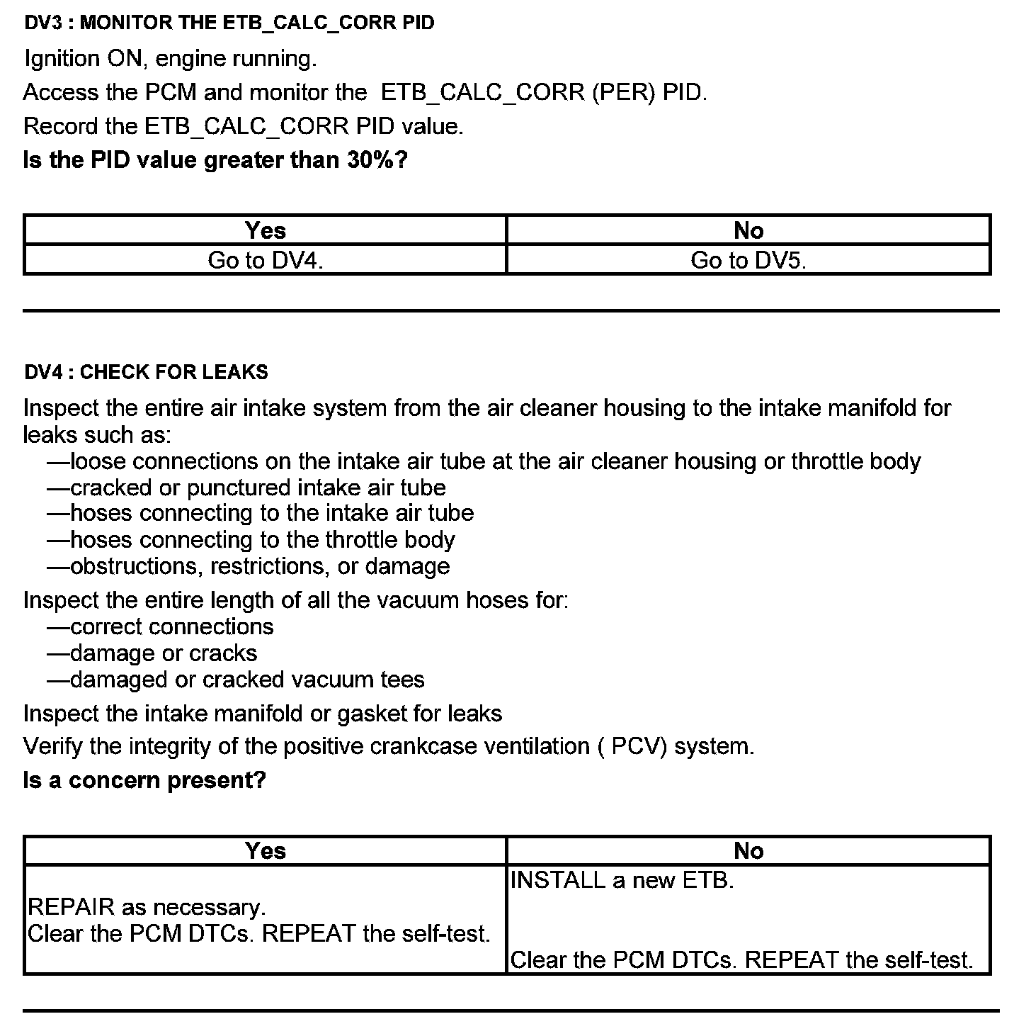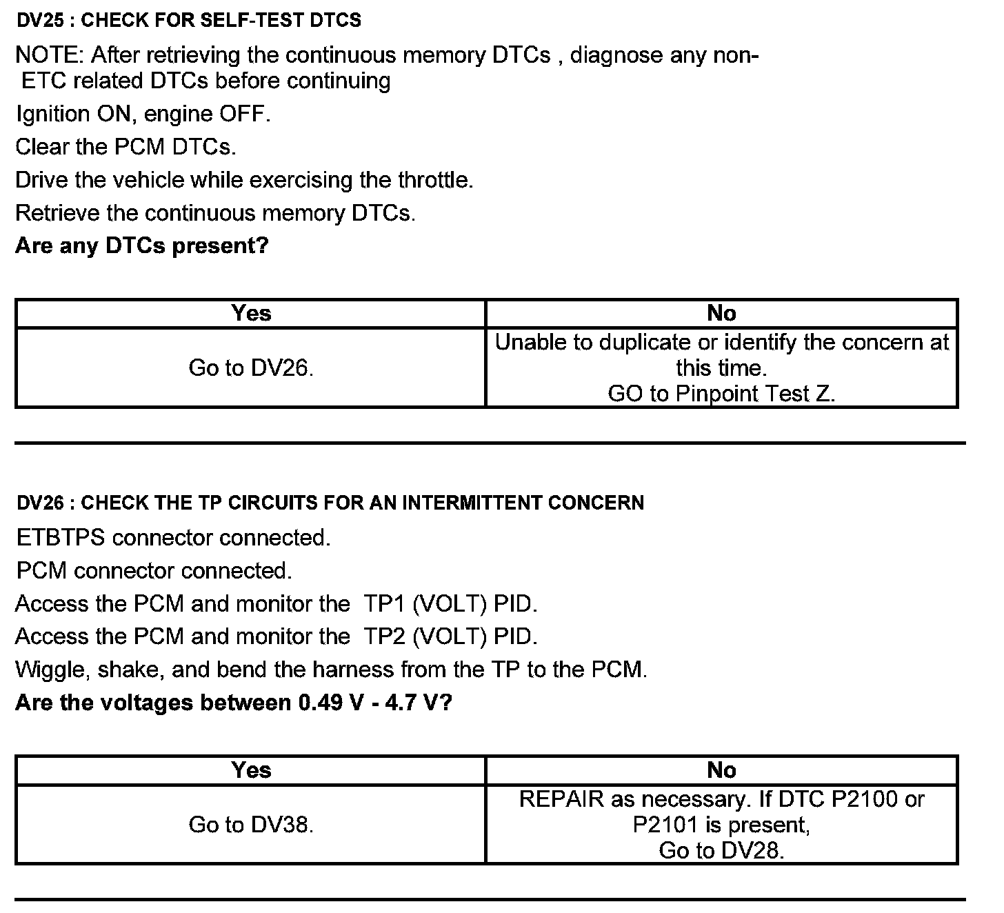 Home >> Ford >> 2012 >> Edge AWD V6-3.7L >> Repair and Diagnosis >> Powertrain Management >> Computers and Control Systems >> Testing and Inspection >> Pinpoint Tests >> Test DV: Throttle Body Assembly Electronic Throttle Control (ETC)