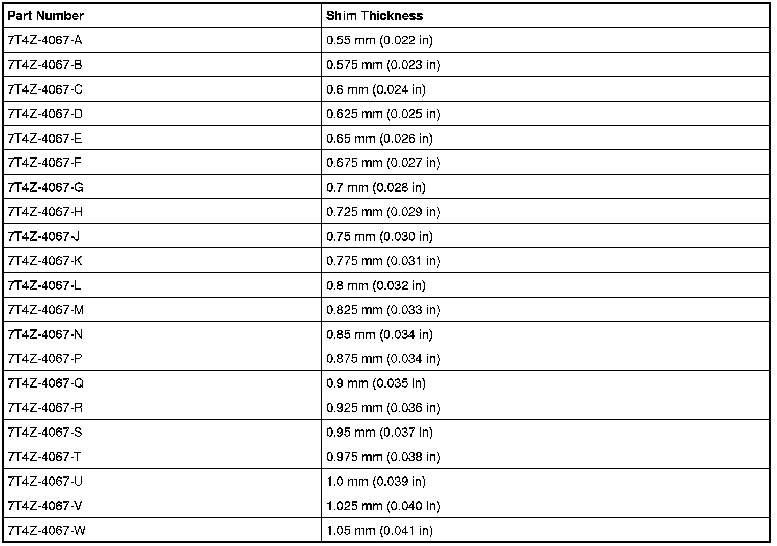 Differential Bearing Preload Shim Selection Chart