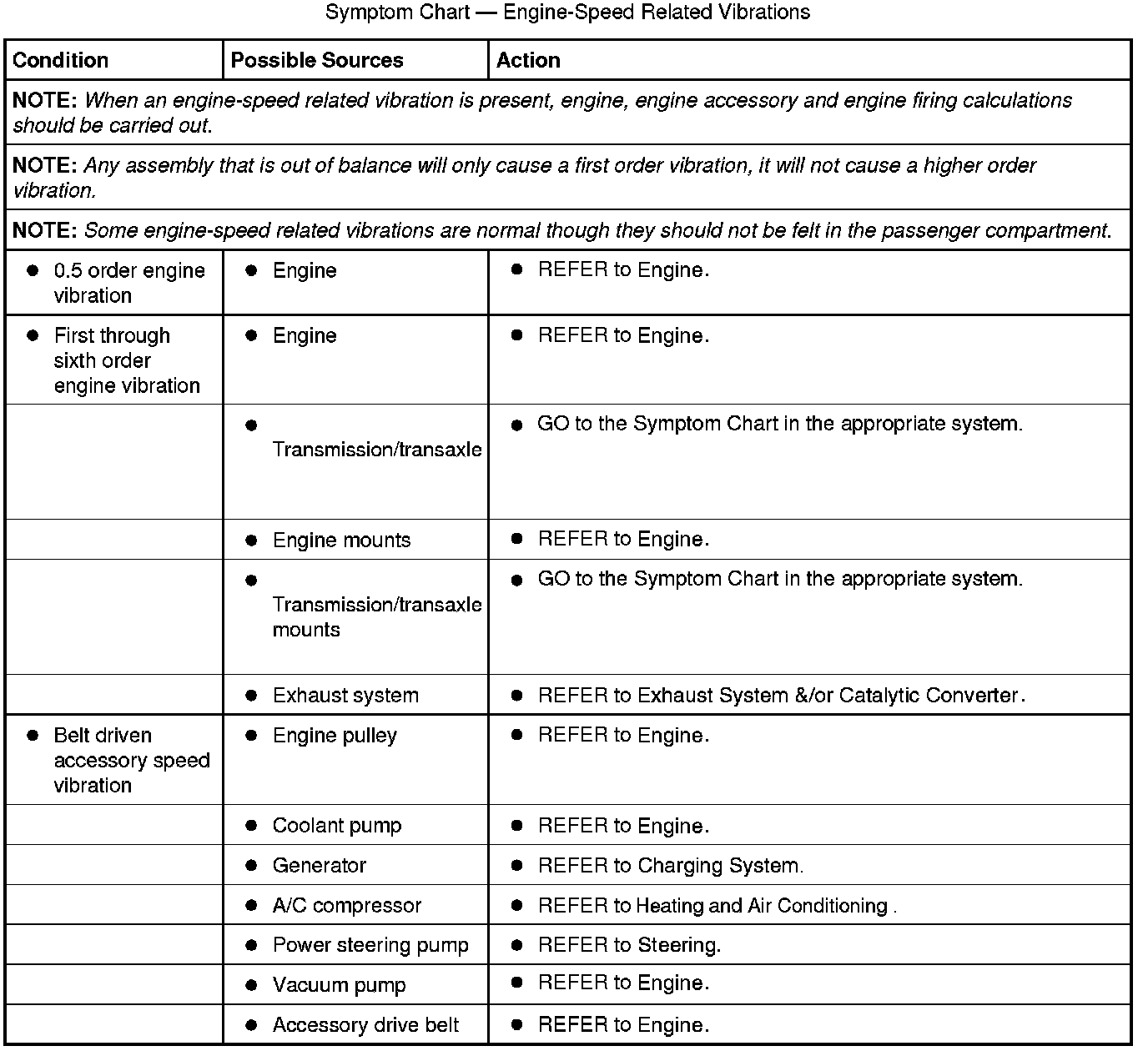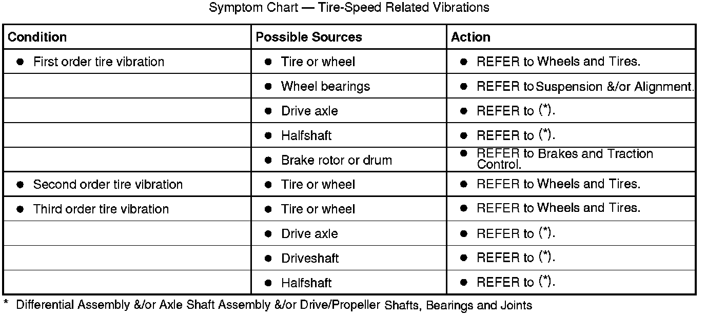 Use the diagnostic instructions along with the necessary listed tools to identify the vibration order and to isolate the symptom and the possible systems associated with that symptom. Then based on the results from the road test, make a determination of which action in the symptom chart to take first. Since it is possible any one of multiple systems may be the cause of the symptom, it may be necessary to use a process of elimination type diagnostic approach to pinpoint the concern. Refer to the system(s) indicated to identify and isolate the cause or rule that system out as being the causal system for the symptom.