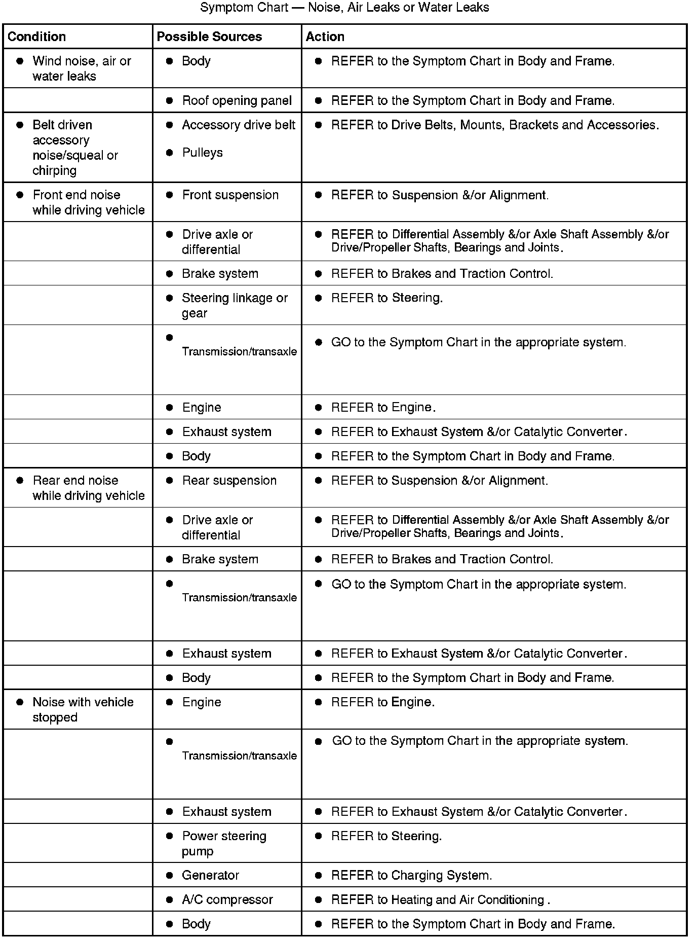 Symptom Chart - Noise, Air Leaks or Water Leaks