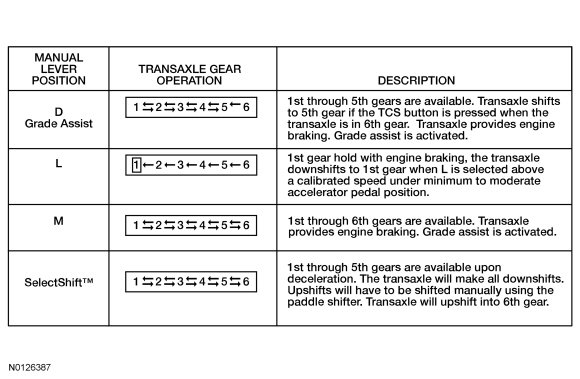 The 6F35 transaxle has 5 range positions: P, R, N, D and L with a TCS (Transmission Control Switch). The 6F50/6F55 transaxle has 5 range positions P, R, N, D and M with a SelectShift(TM) switch or paddle shifters.