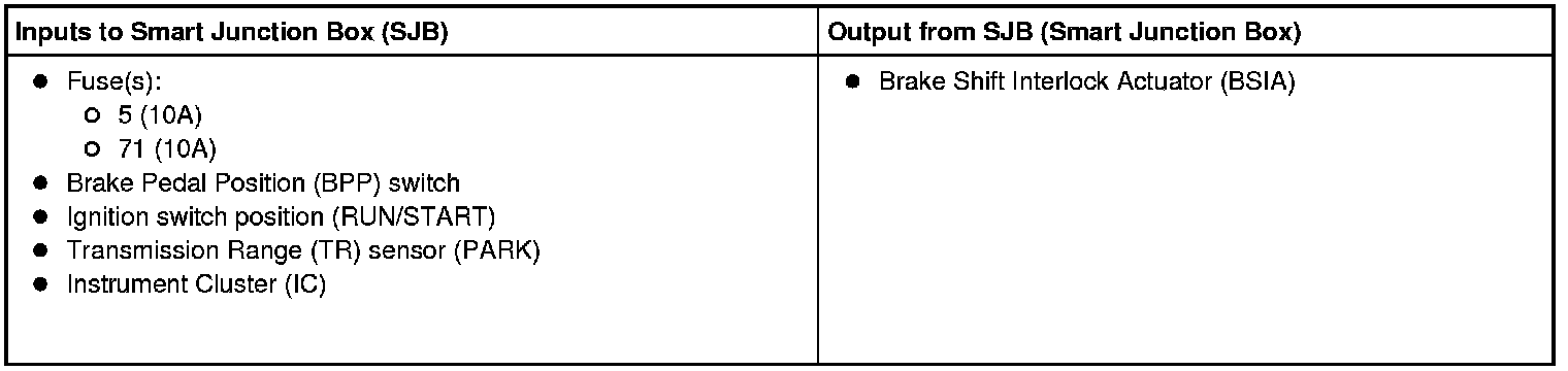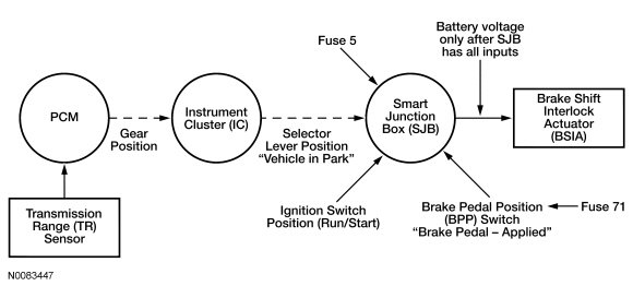 The BSIA (Brake Shift Interlock Actuator) inhibits the selector lever movement from the PARK position by mechanically blocking the detent pawl of the selector lever mechanism. When the brake pedal is pressed (BPP (Brake Pedal Position) switch closed) with the ignition key in the RUN/START position and the transmission in PARK, the BSIA (Brake Shift Interlock Actuator) is energized by the SJB (Smart Junction Box), this allows the selector lever to be moved out of the PARK position.