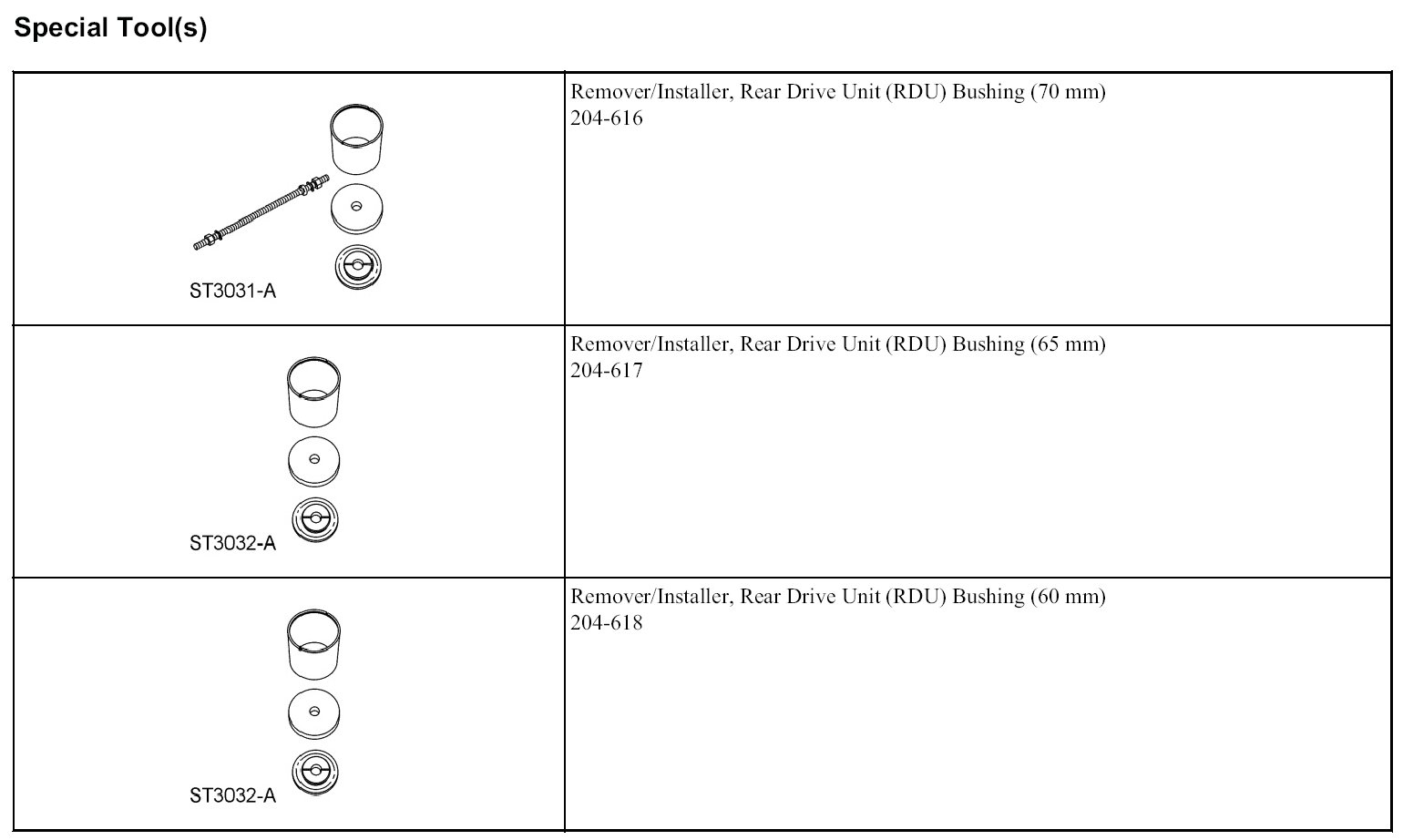 - When installing the RDU bushing, 204-617/2 will fall away as the RDU bushing is installed into the subframe. The Rear Drive Unit (RDU) Bushing Remover/Installer does not control the depth of the bushing, continue to tighten the nut until the RDU bushing is fully seated into the subframe.