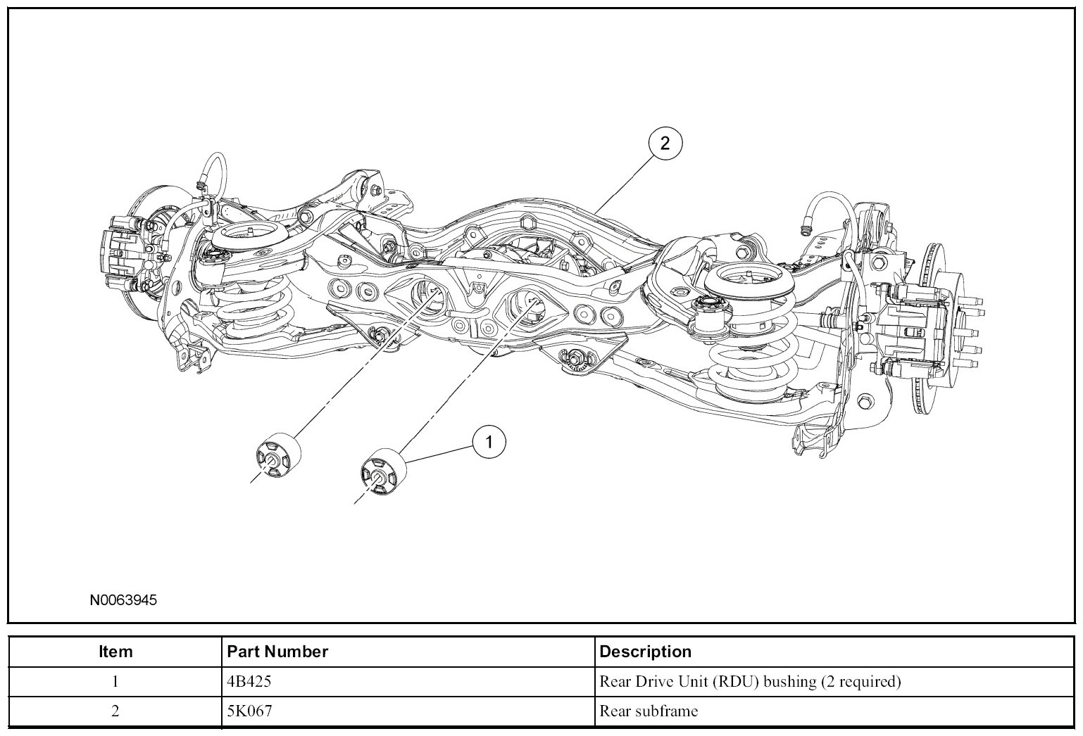 - For subframe revision 8T43-5K067-BA, the RDU bushing must be inset 2 mm (0.08 in).