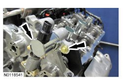 21. NOTE: The 2 VCT (Variable Camshaft Timing) oil control solenoids are removed for clarity.