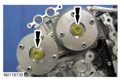 NOTICE: The following steps are only for the replacement of the secondary timing chain tensioners. Do not reuse the secondary timing chain tensioners if removed or damage to the engine may occur.