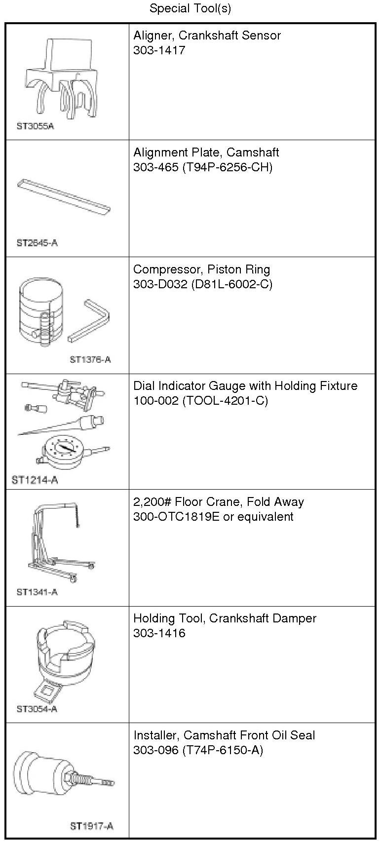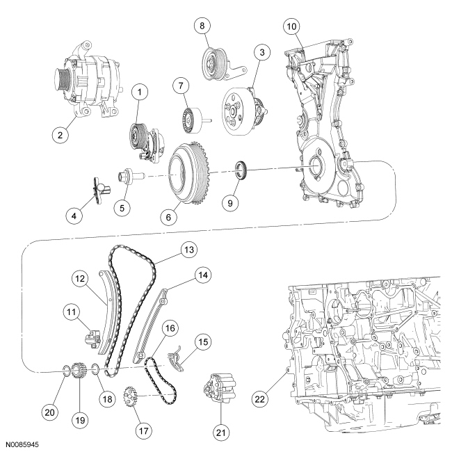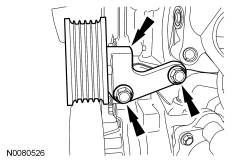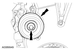 NOTICE: Do not loosen or remove the crankshaft pulley bolt without first installing the special tools as instructed in this procedure. The crankshaft pulley and the crankshaft timing sprocket are not keyed to the crankshaft. The crankshaft, the crankshaft sprocket and the pulley are fitted together by friction, using diamond washers between the flange faces on each part. For that reason, the crankshaft sprocket is also unfastened if the pulley bolt is loosened. Before any repair requiring loosening or removal of the crankshaft pulley bolt, the crankshaft and camshafts must be locked in place by the special service tools, otherwise severe engine damage may occur.