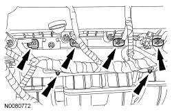 102. Connect the 4 fuel injector electrical connectors. Attach the 2 wiring harness retainers.