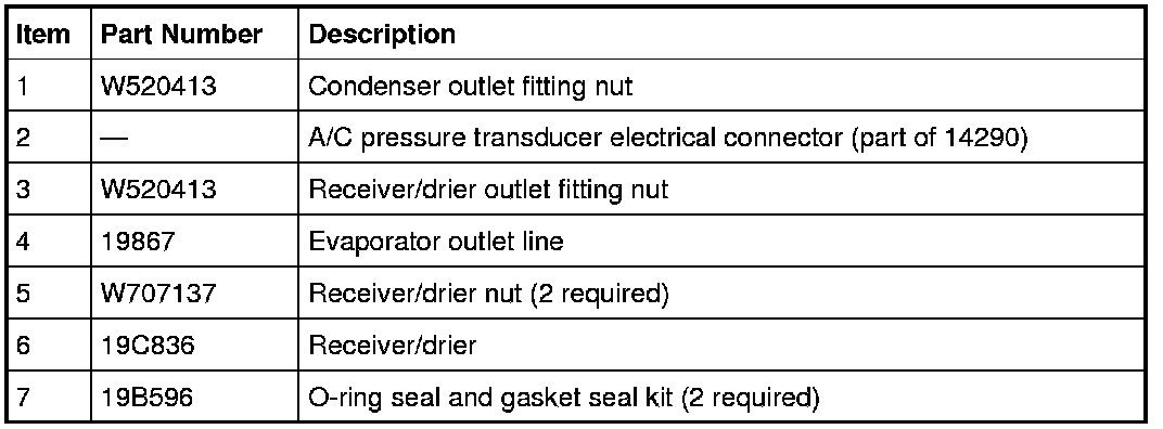 NOTE: Installation of a new receiver/drier is not required when repairing the A/C system, except when there is physical evidence of contamination from a failed A/C compressor or damage to the receiver/drier. Damage to the receiver/drier includes leaks, physical damage to the receiver/drier shell or desiccant, or moisture contamination. Moisture contamination results only from a complete loss of refrigerant, and equalization of the refrigerant system pressure with atmospheric pressure for a period longer than one hour. If even a slight amount of positive refrigerant pressure is present in the refrigerant system before repairs are carried out, a new receiver/drier should not be installed.
