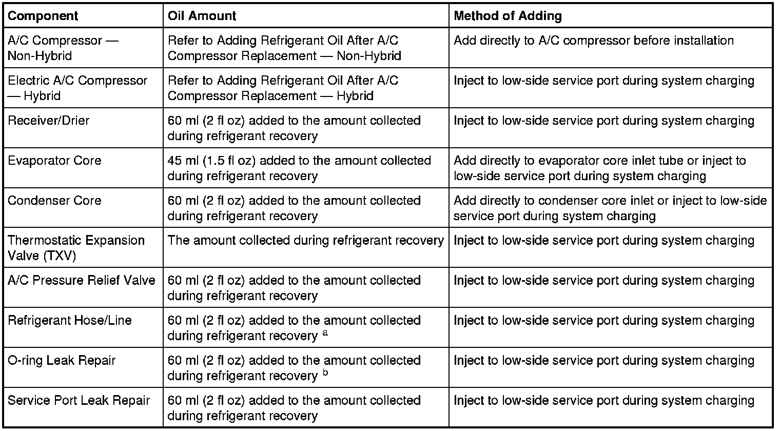 b The amount specified may be used for one or multiple O-ring leak repairs. Do not multiply the refrigerant oil amount by the number of O-ring leaks being repaired.
