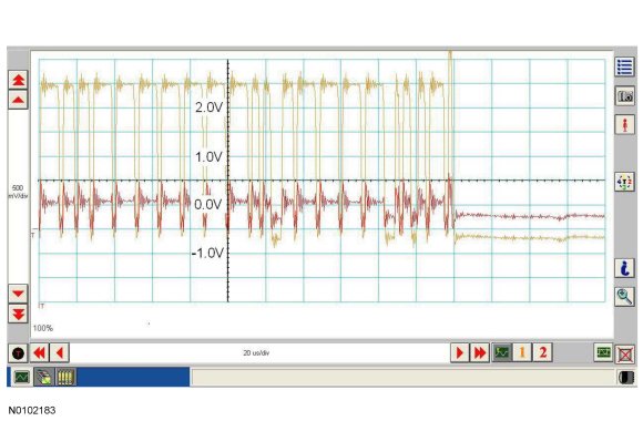 NOTE: The oscilloscope traces below are from the Integrated Diagnostic System (IDS) oscilloscope taken using the IDS (Integrated Diagnostic System) pre-configured Controller Area Network (CAN) settings. The traces are for both data (+) and data (-) taken simultaneously (2-channel) at a sample rate of 1 mega-sample per second (1MS/s) or greater.