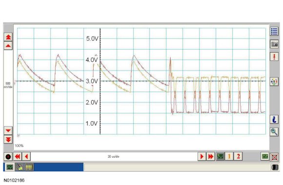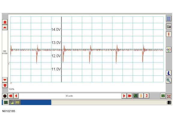 Traces below are viewed at 500mV per division (vertical axis) and 20 microseconds (20micros) per division (horizontal axis). Readings taken with a different oscilloscope vary from those shown. Compare any suspect readings to a known good vehicle.