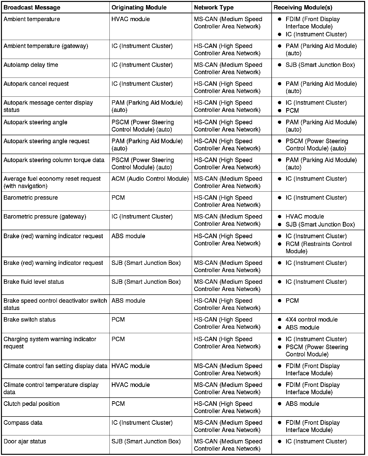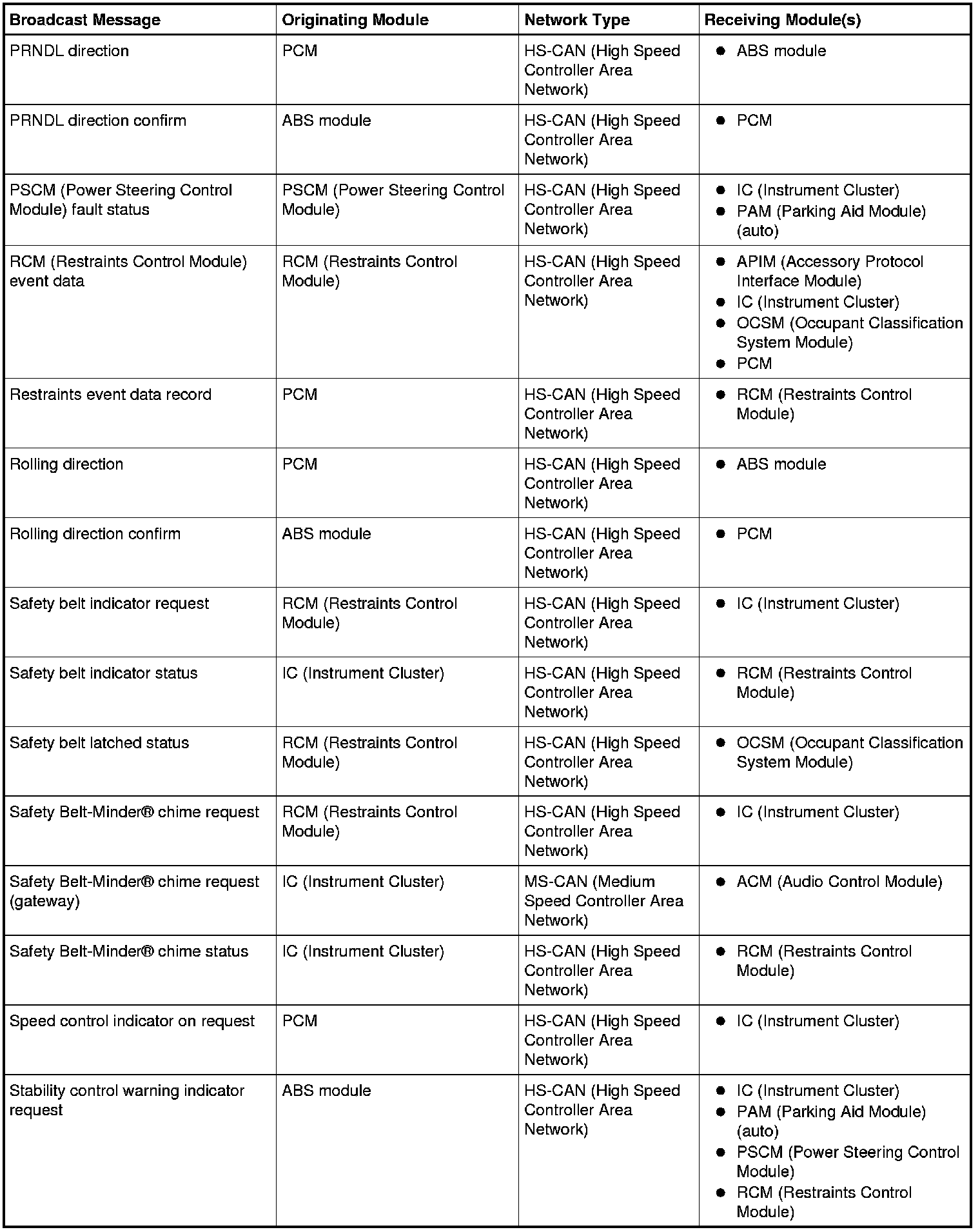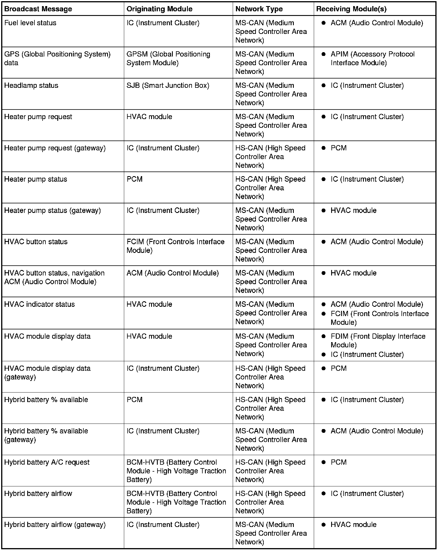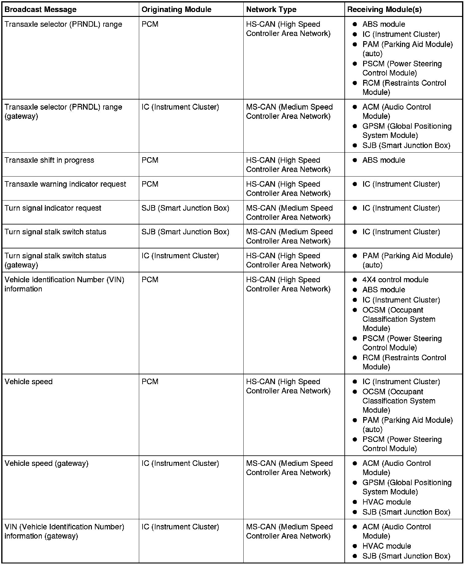 Modules on the CAN (Controller Area Network) utilize simultaneous communication of 2 or more messages on the same network circuits. The following chart summarizes the messages sent and received on the network.