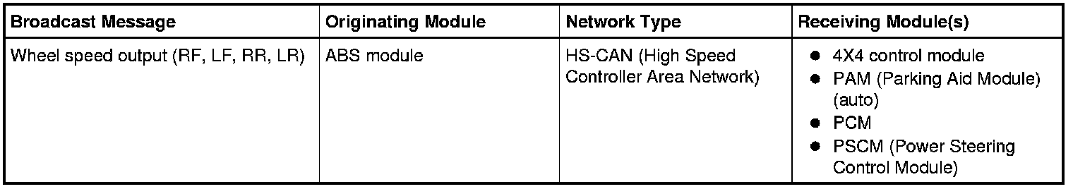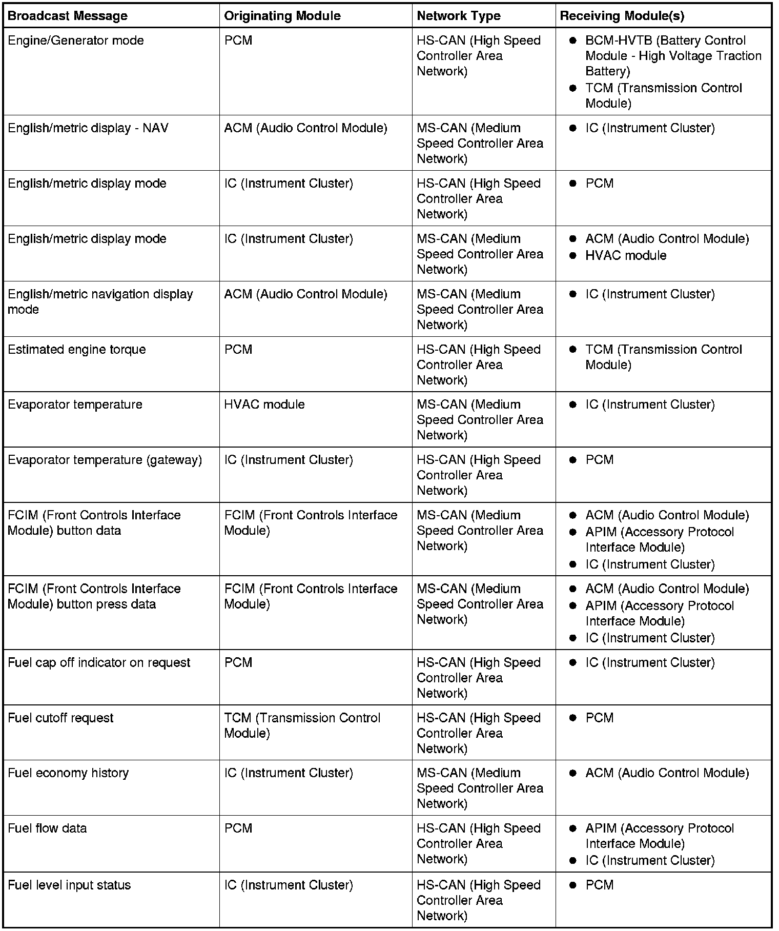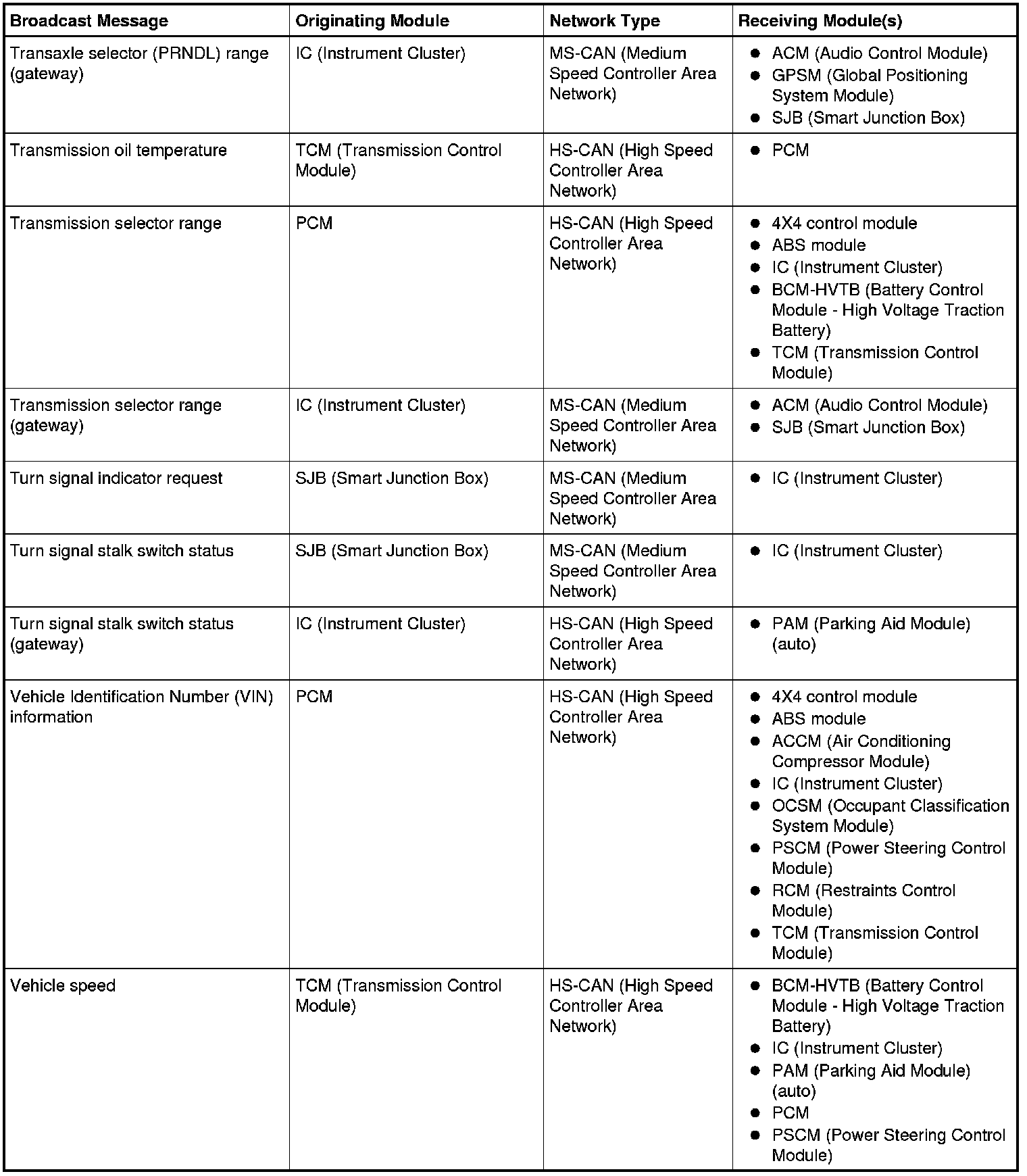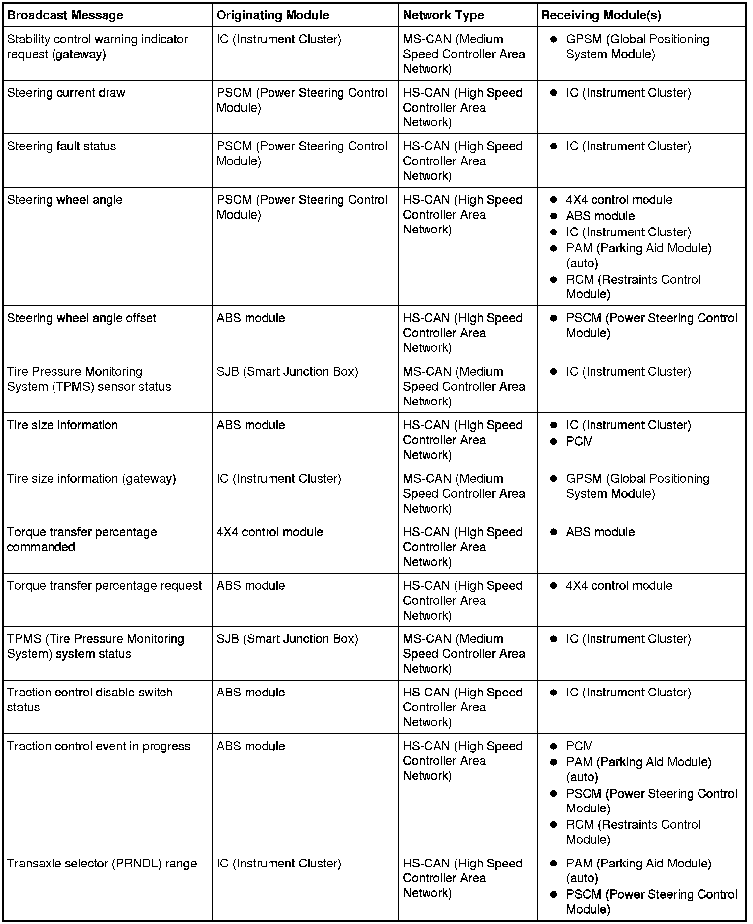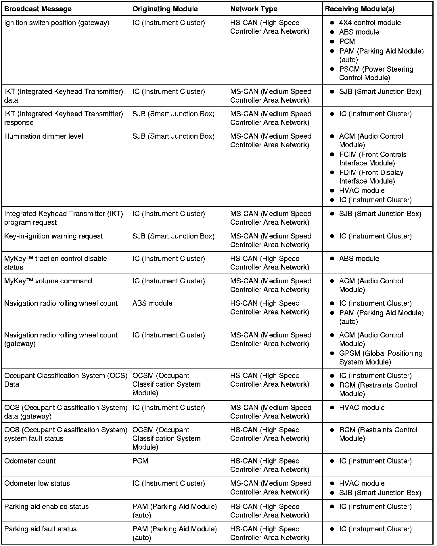 Modules on the CAN (Controller Area Network) utilize simultaneous communication of 2 or more messages on the same network circuits. The following chart summarizes the messages sent and received on the network.