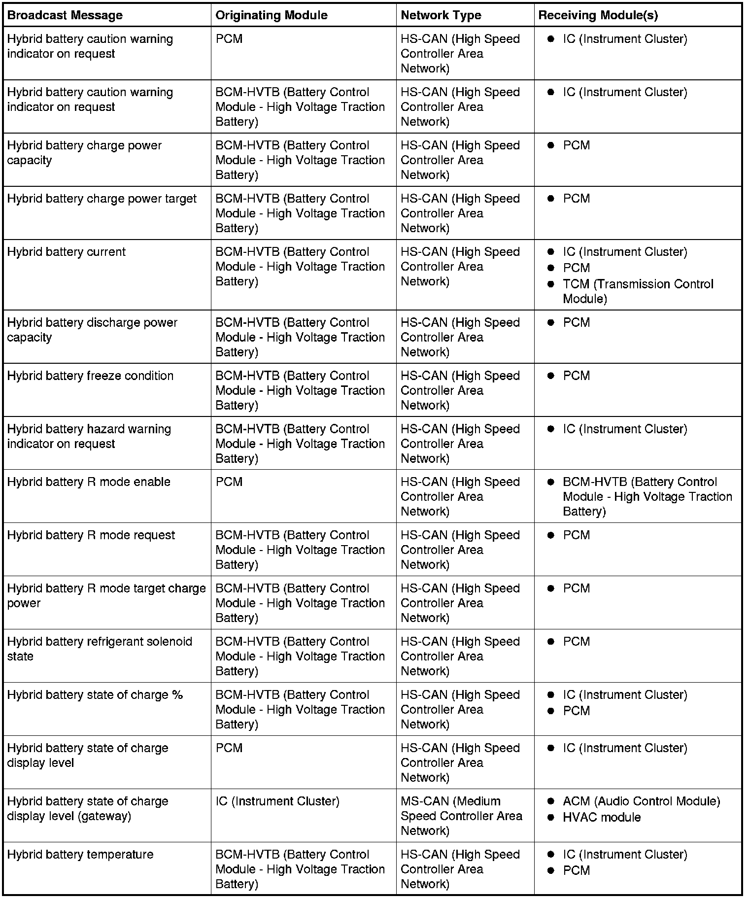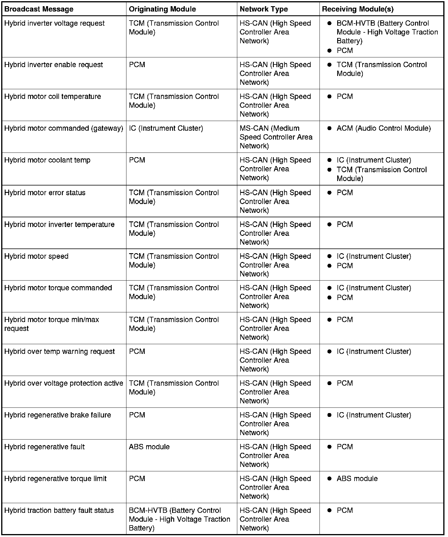CAN (Controller Area Network) Module Communication Message Chart - Hybrid