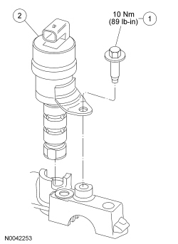 2. Remove the bolt and the Variable Camshaft Timing (VCT) oil control solenoid.