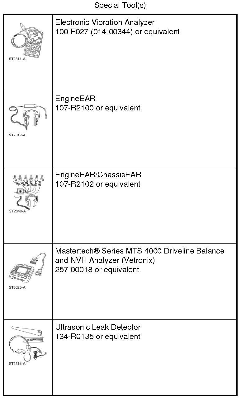 The following diagnostic tools and techniques can be used separately or in conjunction with each other to aid in the diagnosis of NVH symptoms. They are listed in order of preference for ease in their use for locating these symptoms.