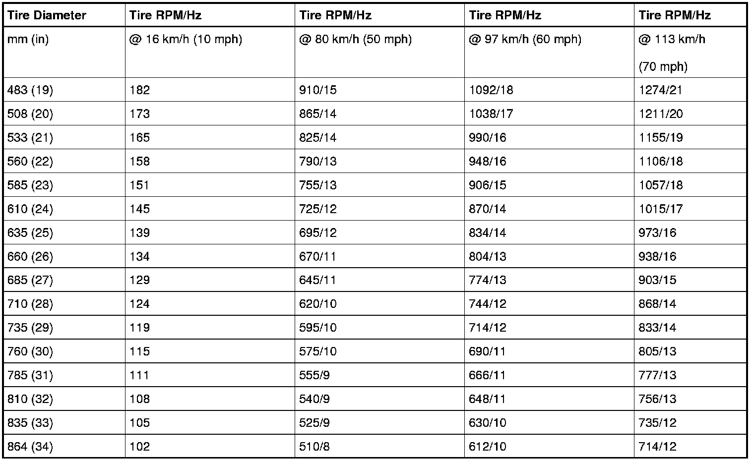- Obtain the corresponding tire and wheel rpm and frequency from the Tire Speed and Frequency Chart.