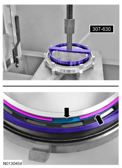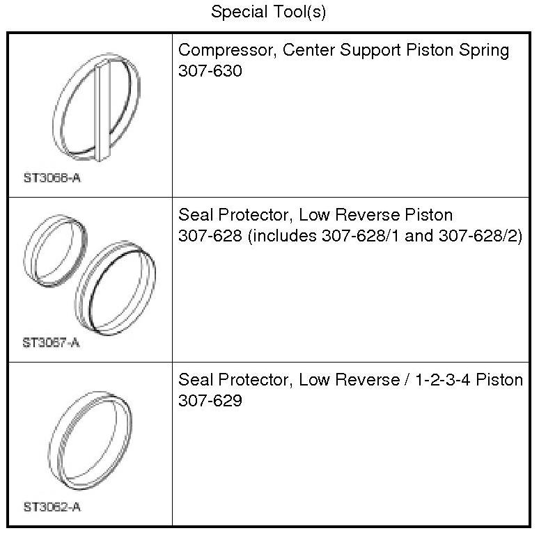 Install the Low Reverse Piston Seal Protector 307-628/2 and the Low Reverse / 1-2-3-4 Piston Seal Protector 307-629 on the forward clutch piston side of the center support.