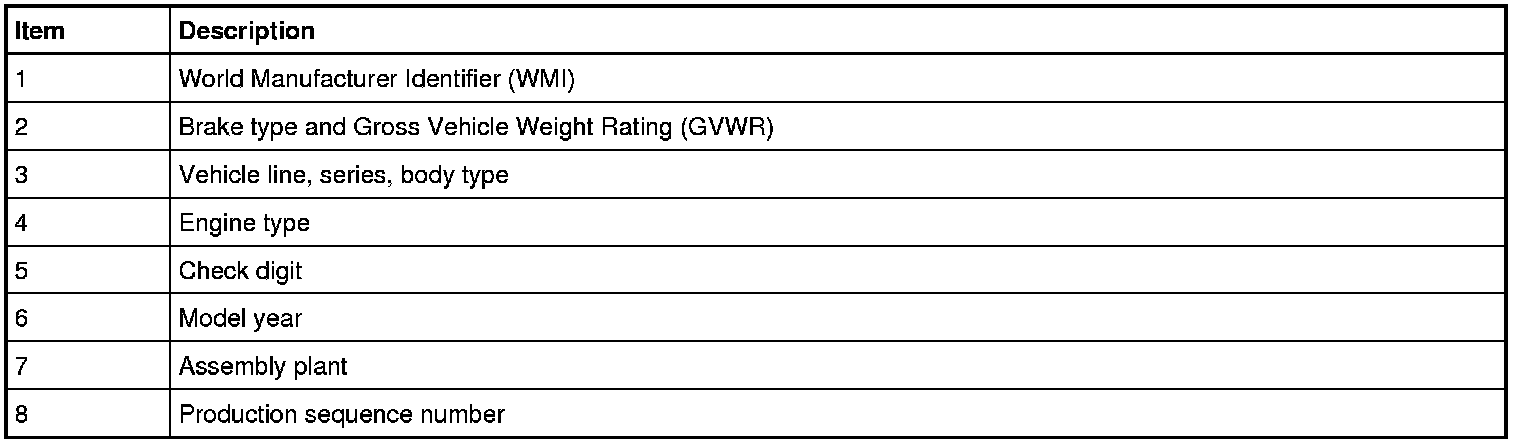The fourth VIN (Vehicle Identification Number) position is the vehicle brake type and GVWR (Gross Vehicle Weight Rating) code, all vehicles use hydraulic brakes and driver and front passenger air bags.