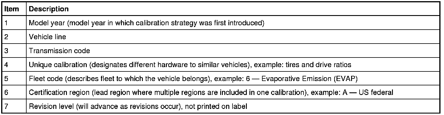 NOTE: Powertrain calibration information is limited to a maximum of 5 characters per line on the Vehicle Certification (VC) label. Because of this, calibration identification consisting of more than 5 characters will wrap to the second line on the VC (Vehicle Certification) label.