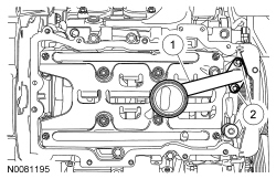 82. NOTICE: Failure to use the correct special tools, assembled as shown in the illustration, will result in damage to the coolant pump pulley and/or special tools.