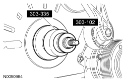 - Using the Camshaft Pulley Installer, Power Steering Pump Pulley Installer and the Water Pump Pulley Spacer, install a new service coolant pump pulley flush with the end of the camshaft.