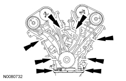 Apply an 8 mm (0.31 in) dot of silicone gasket and sealant at the cylinder block to front cover mating surface and the cam seal retainer-to-cylinder head joints.