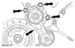 83. NOTICE: Failure to use the correct special tools, assembled as shown in the illustration, will result in damage to the coolant pump pulley and/or special tools.