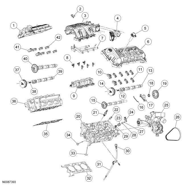 NOTICE: During engine repair procedures, cleanliness is extremely important. All parts must be thoroughly cleaned and any foreign material, including any material created while cleaning gasket surfaces, that enters the oil passages, coolant passages or the oil pan, can cause engine failure.