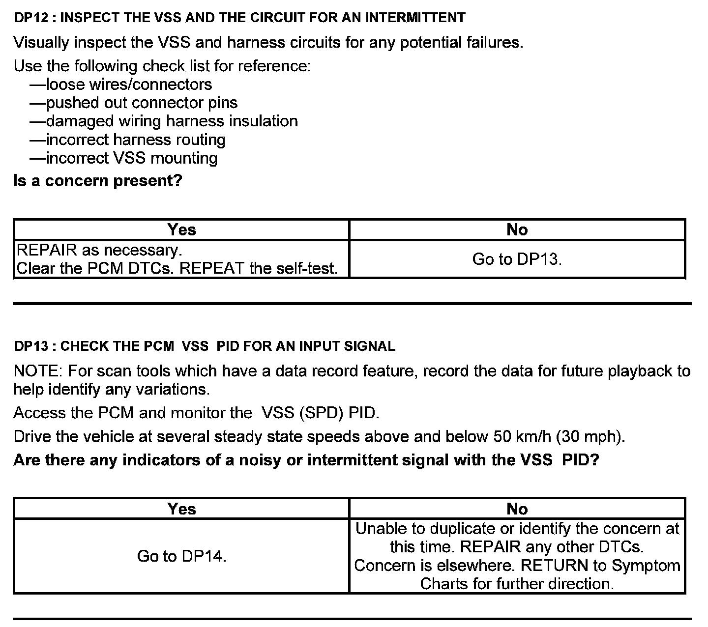 Home >> Ford >> 2012 >> Escape 2WD V6-3.0L >> Repair and Diagnosis >> Powertrain Management >> Computers and Control Systems >> Testing and Inspection >> Pinpoint Tests >> Test DP: Output Shaft Speed (OSS) Sensor/Vehicle Speed Sensor (VSS)