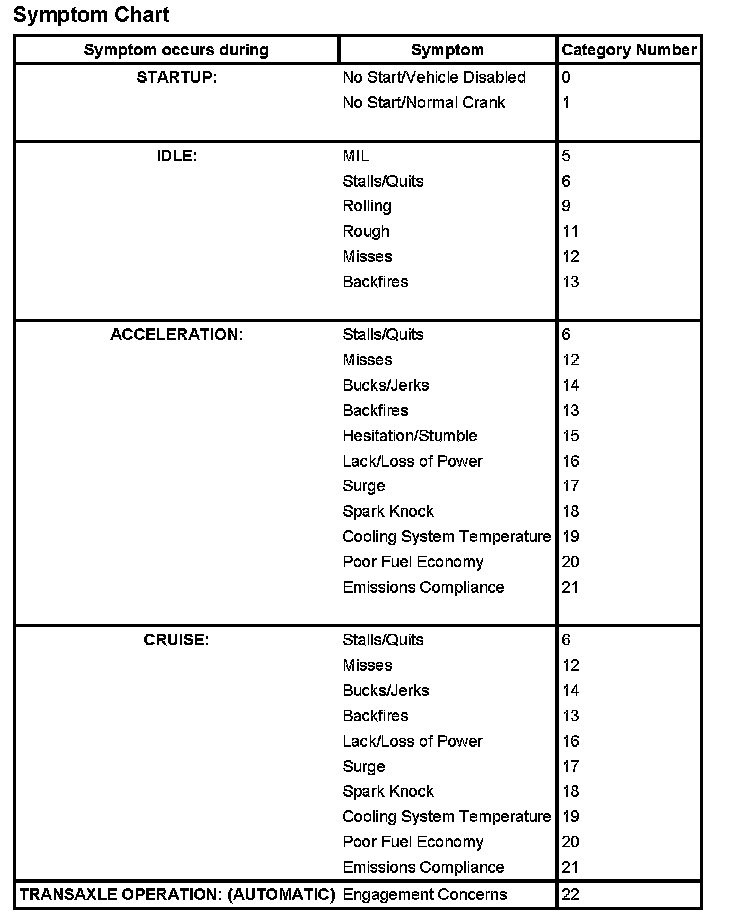 The Reference Value Symptom Chart provides guidance in selecting the appropriate parameter identification (PID) or measured signal related to the fault area. Select a symptom from the symptom chart along with the category number and go to the PID/Measured Signal Chart. For multiple symptoms, select the symptom that is most evident. Reference Value (PID)/Measured Signal Chart