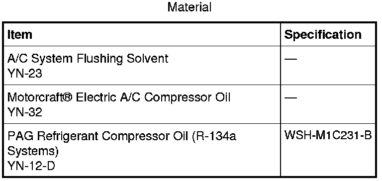 NOTICE: Motorcraft(R) Electric A/C Compressor Oil only must be used as a refrigerant system lubricant for hybrid vehicles. Addition of any oil other than Motorcraft(R) Electric A/C Compressor Oil to the hybrid vehicle refrigerant system will damage the electric Air Conditioning (A/C) compressor and contaminate the refrigerant system. For additional information, refer to Refrigerant Oil Adding Refrigerant Oil Adding.