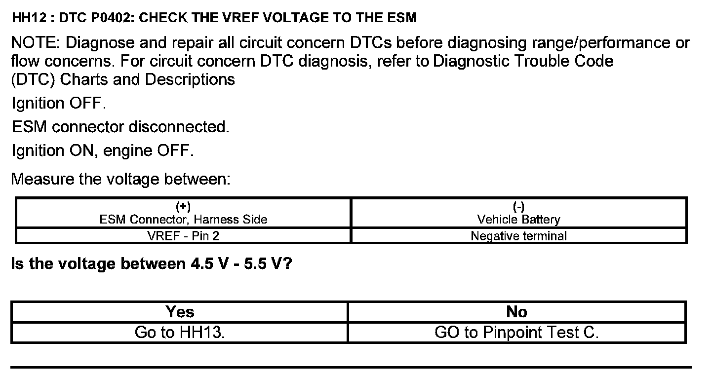 Home >> Ford >> 2012 >> Escape 4WD L4-2.5L >> Repair and Diagnosis >> Powertrain Management >> Computers and Control Systems >> Testing and Inspection >> Pinpoint Tests >> Test HH: Exhaust Gas Recirculation System Module (ESM) >> Manual Transmission