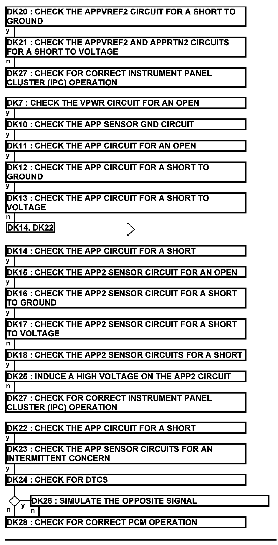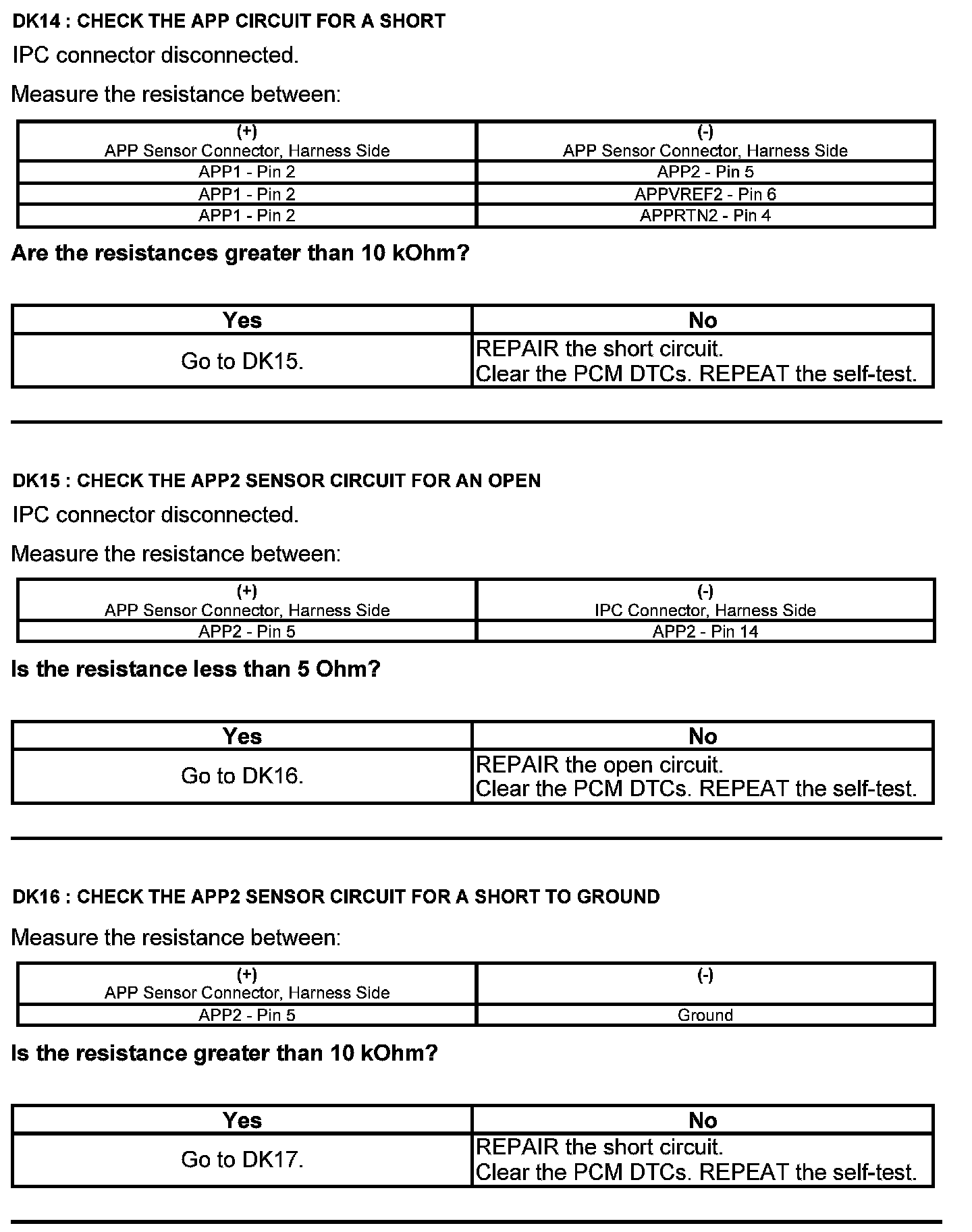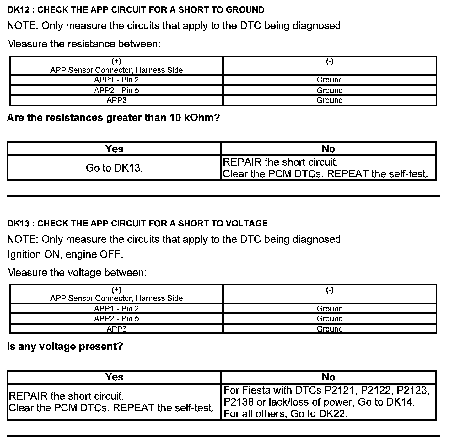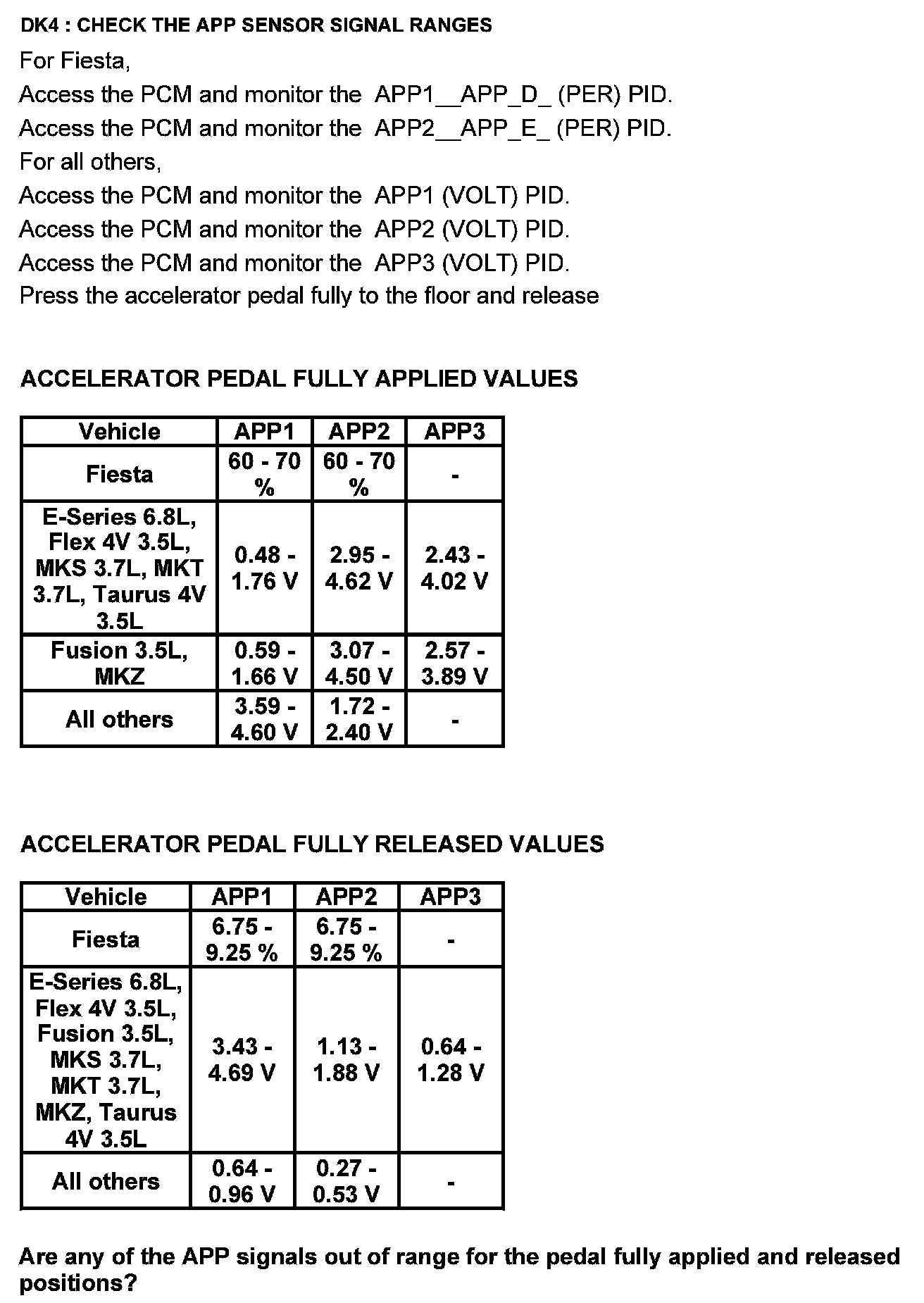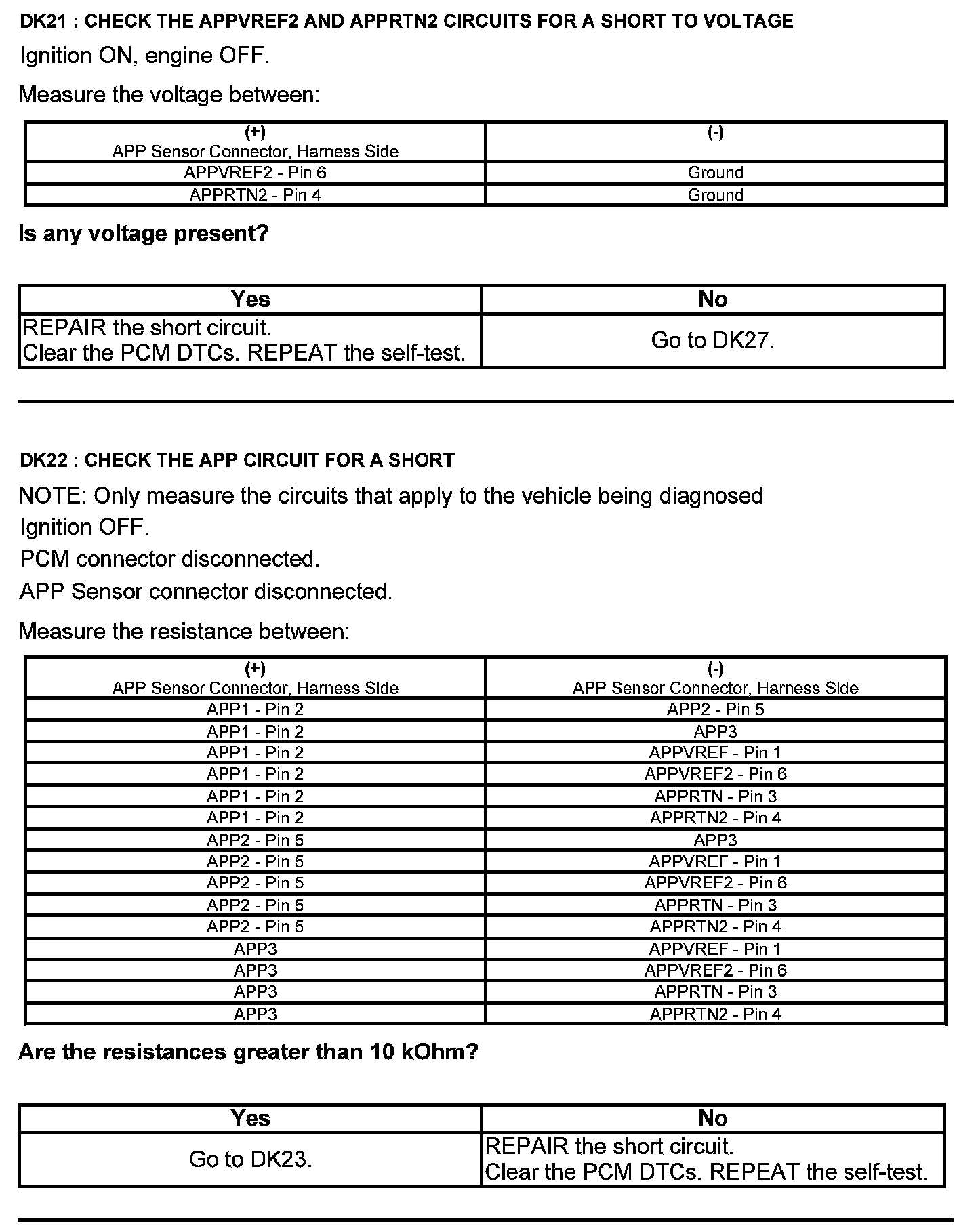 Home >> Ford >> 2012 >> Escape 4WD V6-3.0L >> Repair and Diagnosis >> Powertrain Management >> Computers and Control Systems >> Testing and Inspection >> Pinpoint Tests >> Test DK: Accelerator Pedal Position (APP) Sensor