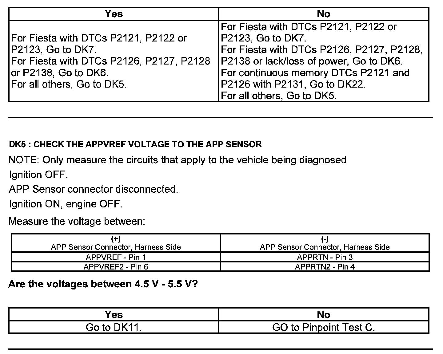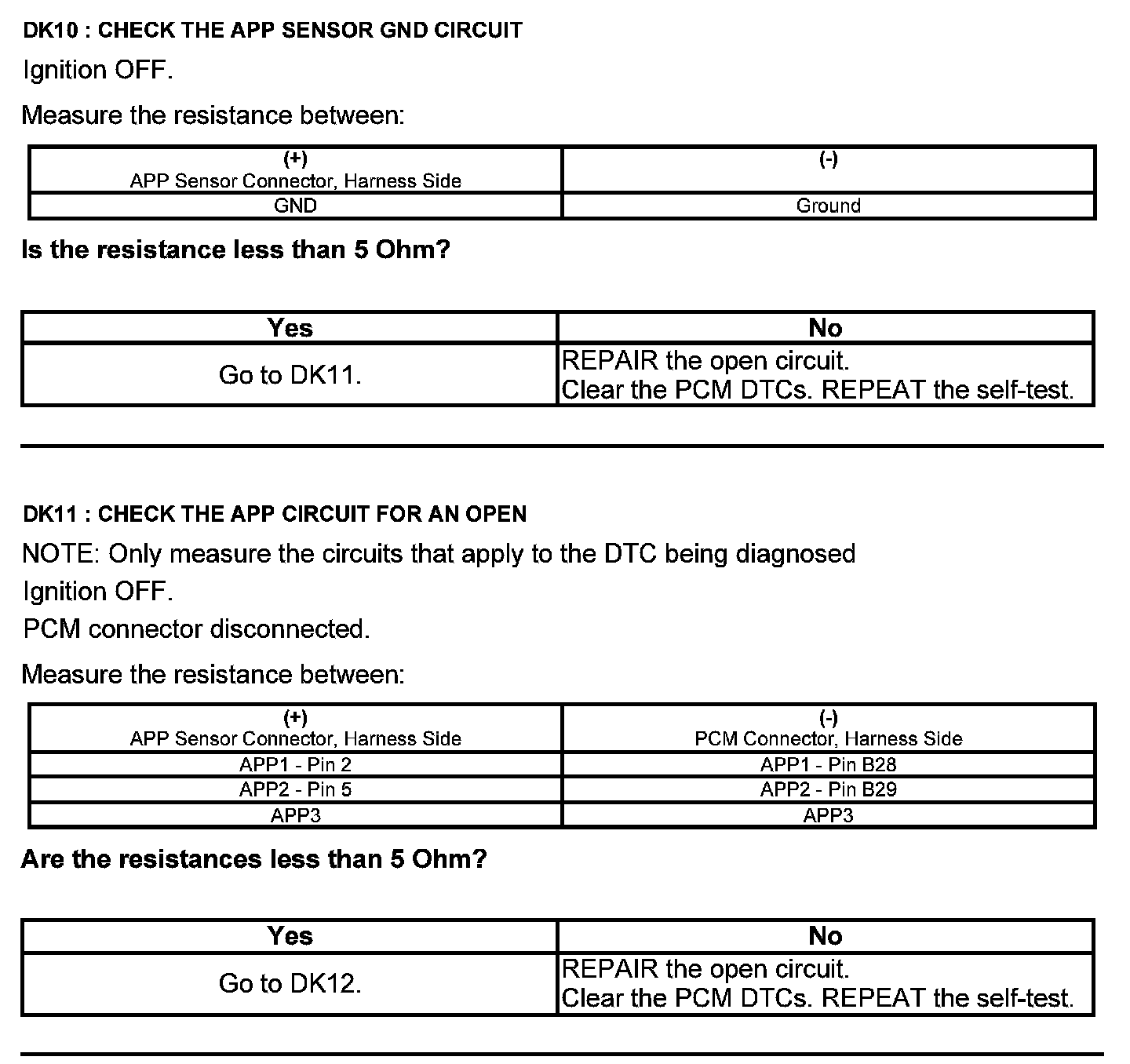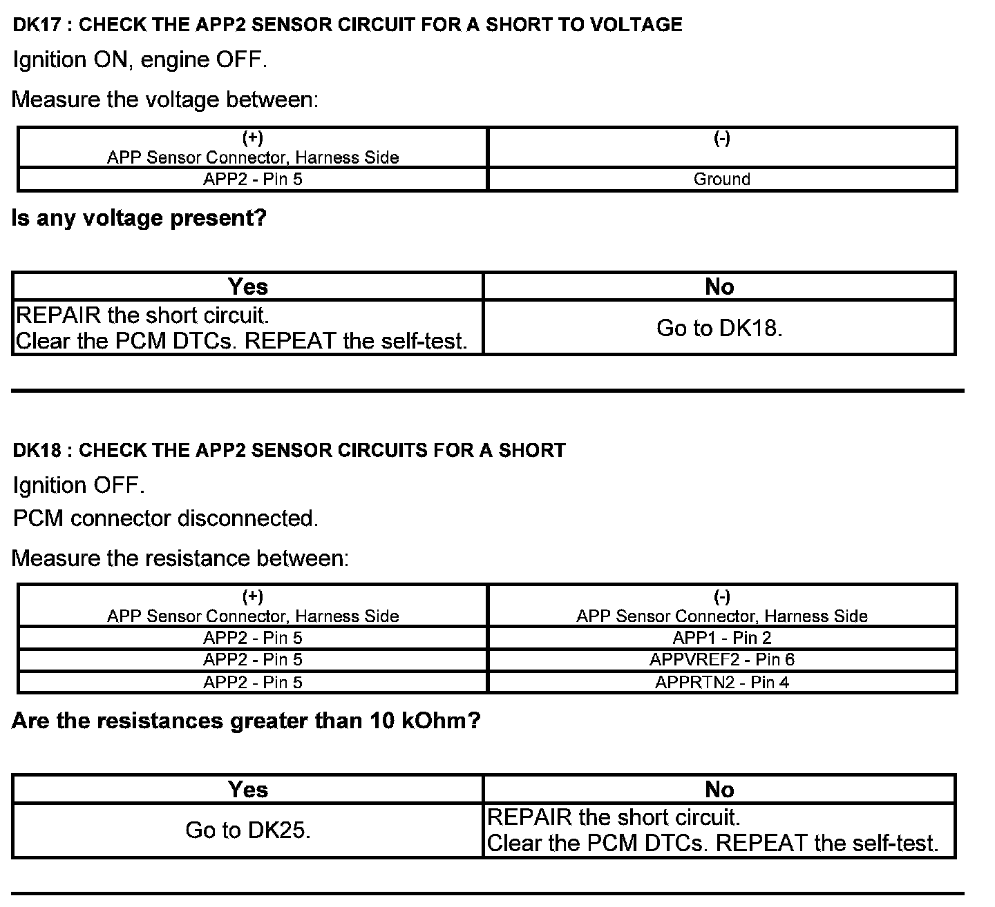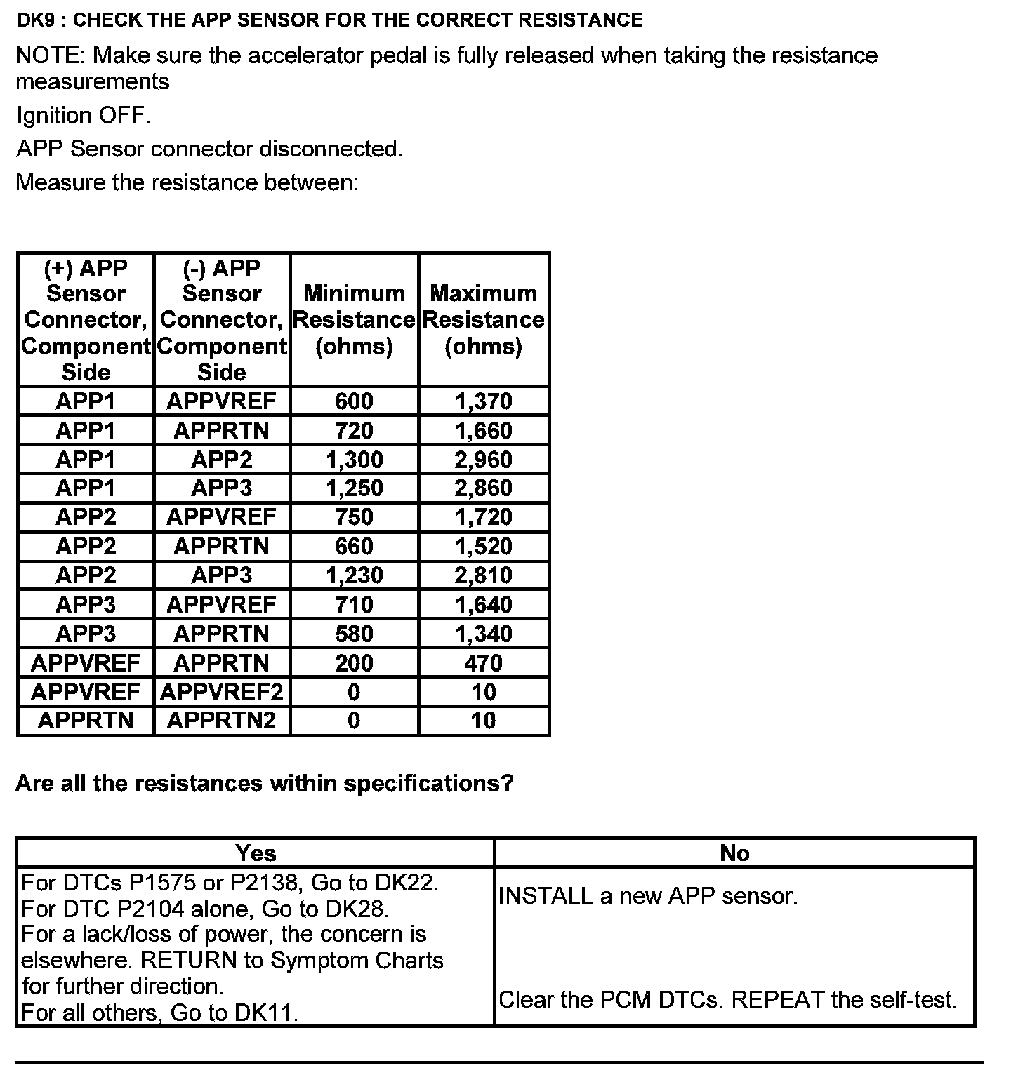 Home >> Ford >> 2012 >> Escape 4WD V6-3.0L >> Repair and Diagnosis >> Powertrain Management >> Computers and Control Systems >> Testing and Inspection >> Pinpoint Tests >> Test DK: Accelerator Pedal Position (APP) Sensor