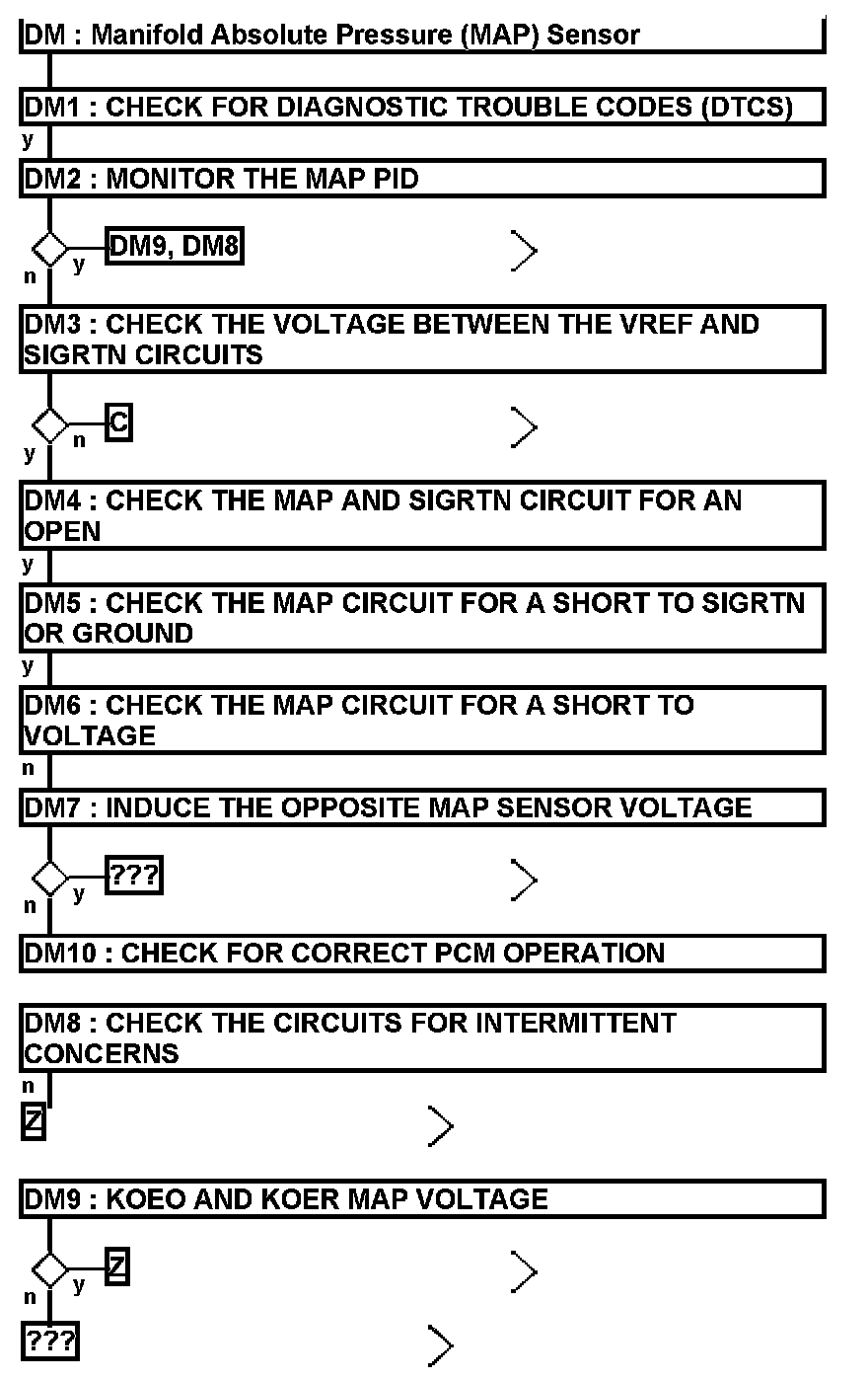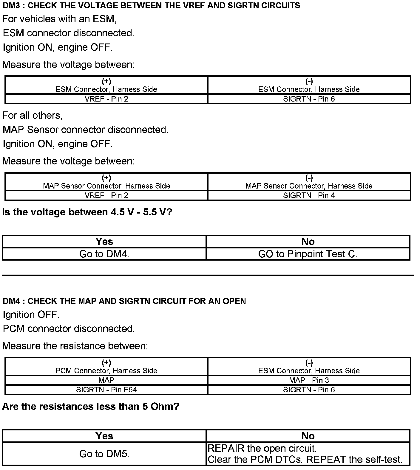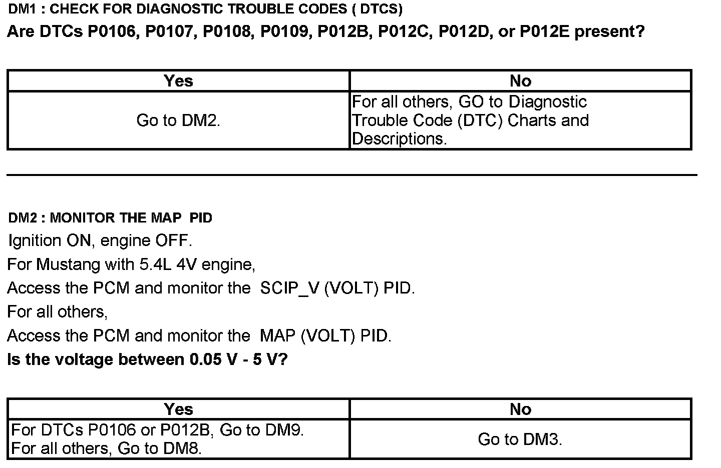Home >> Ford >> 2012 >> Expedition 2WD V8-5.4L >> Repair and Diagnosis >> Powertrain Management >> Computers and Control Systems >> Testing and Inspection >> Pinpoint Tests >> Test DM: Manifold Absolute Pressure (MAP) Sensor