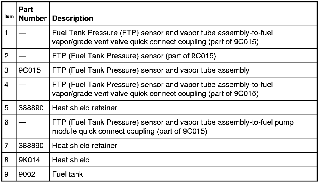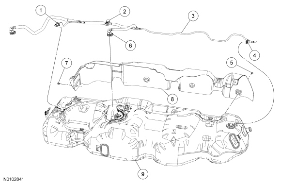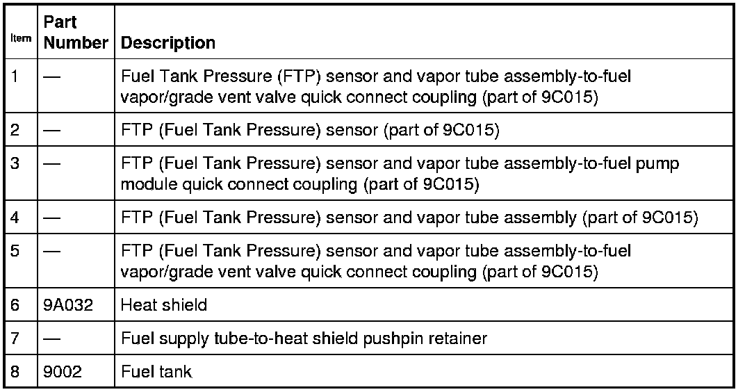 5. Disconnect the Fuel Tank Pressure (FTP) sensor and vapor tube assembly-to-fuel vapor/grade vent valves quick connect couplings. For additional information, refer to Fuel Delivery and Air Induction.