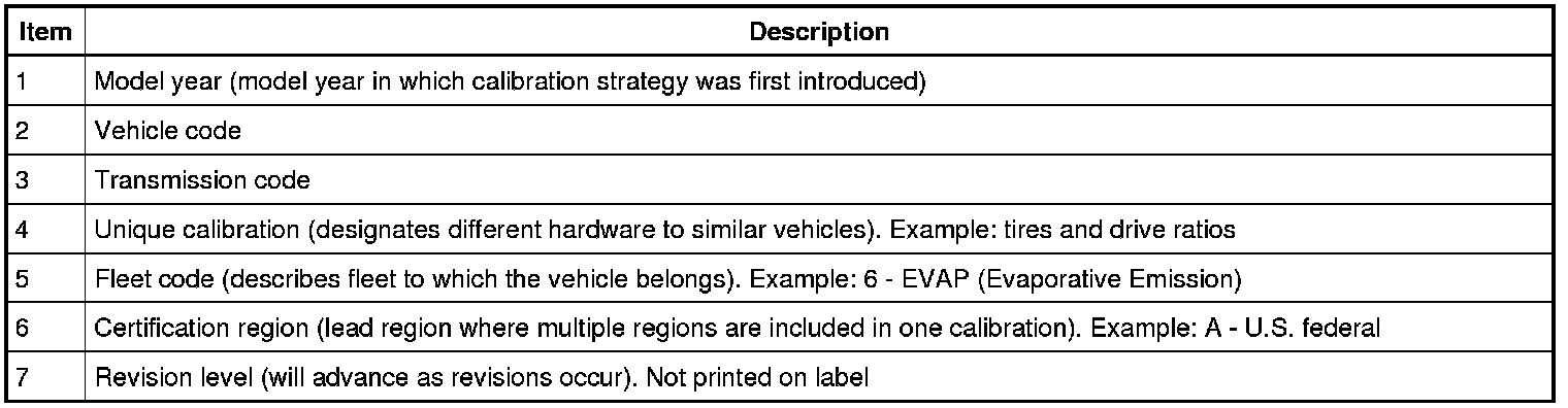 NOTE: Powertrain calibration information is limited to a maximum of 5 characters per line on the VC (Vehicle Certification) label. Because of this, calibration identification consisting of more than 5 characters will wrap to the second line on the VC (Vehicle Certification) label.Powertrain calibration information is printed in the lower right corner of the VC (Vehicle Certification) label. Only base calibration information is printed. Revision levels will not appear, however, they can be obtained through a scan tool using the most current software revision.