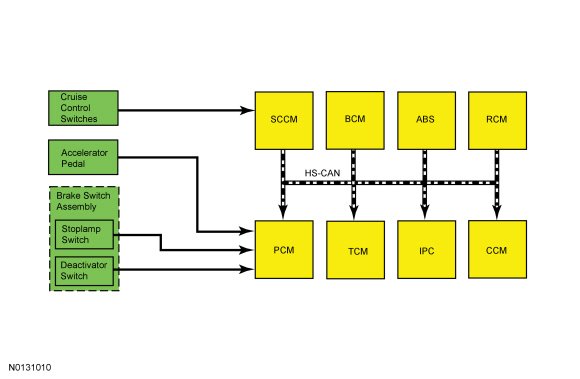 The PCM (Powertrain Control Module) has PIDs (Parameter Identifications) available, through the powertrain DataLogger, that indicate the event that caused the last cruise control deactivation. When the cruise control is turned ON, all current deactivation (or non-activation) conditions are recorded. When the cruise control is turned OFF, event recording stops. The recorded events are stored until the ignition is turned OFF.
