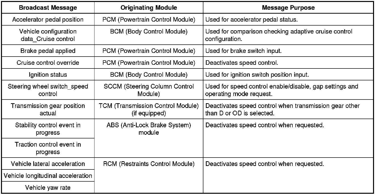 The ABS (Anti-Lock Brake System) module monitors the yaw rate signal from the RCM (Restraints Control Module) and compares it to the wheel speed and steering wheel angle signals. If the ABS (Anti-Lock Brake System) module determines the yaw rate is invalid, the ABS (Anti-Lock Brake System) module disables the adaptive cruise control. The message center displays the message COLLISION WARNING MALFUNCTION and/or ADAPTIVE CRUISE MALFUNCTION.